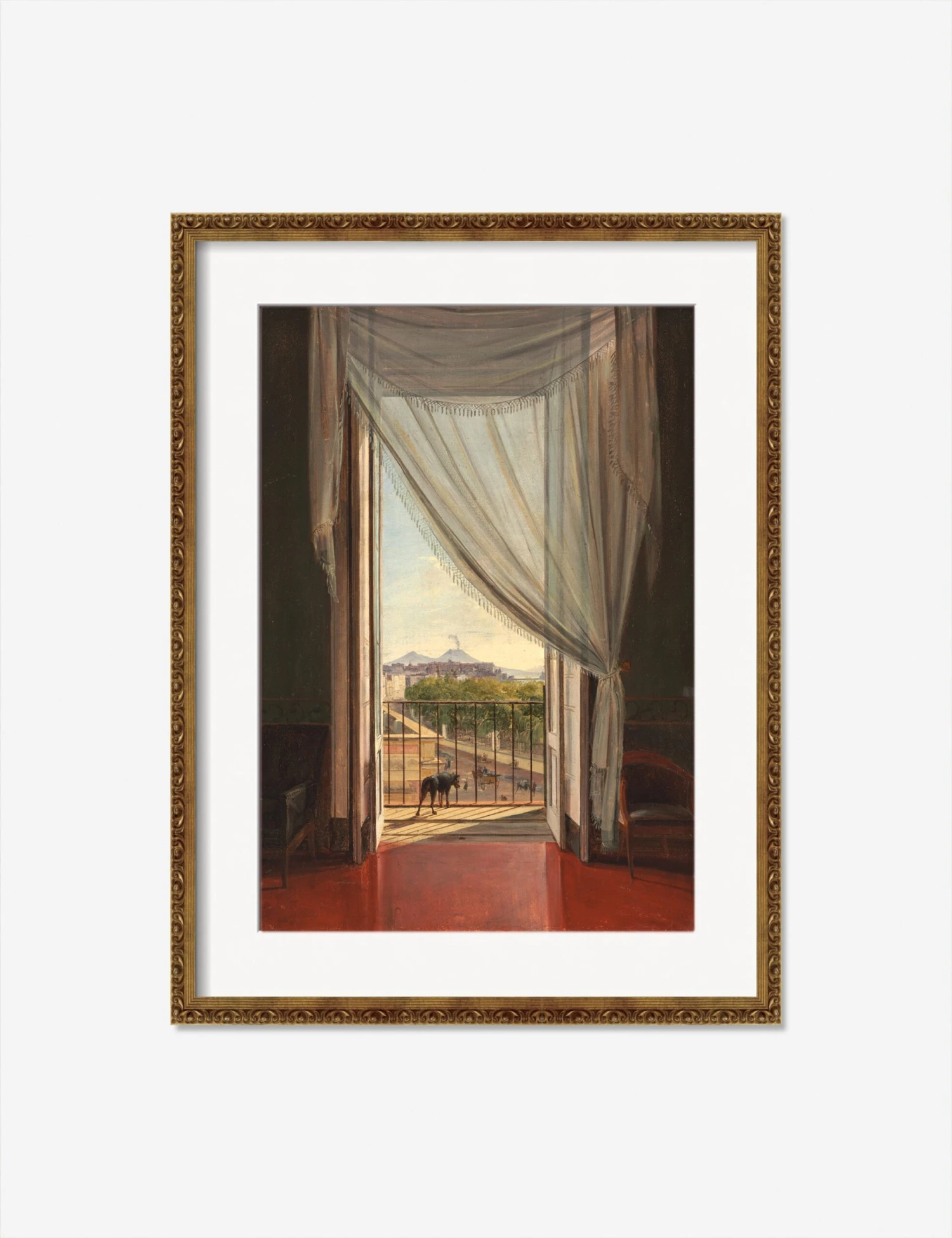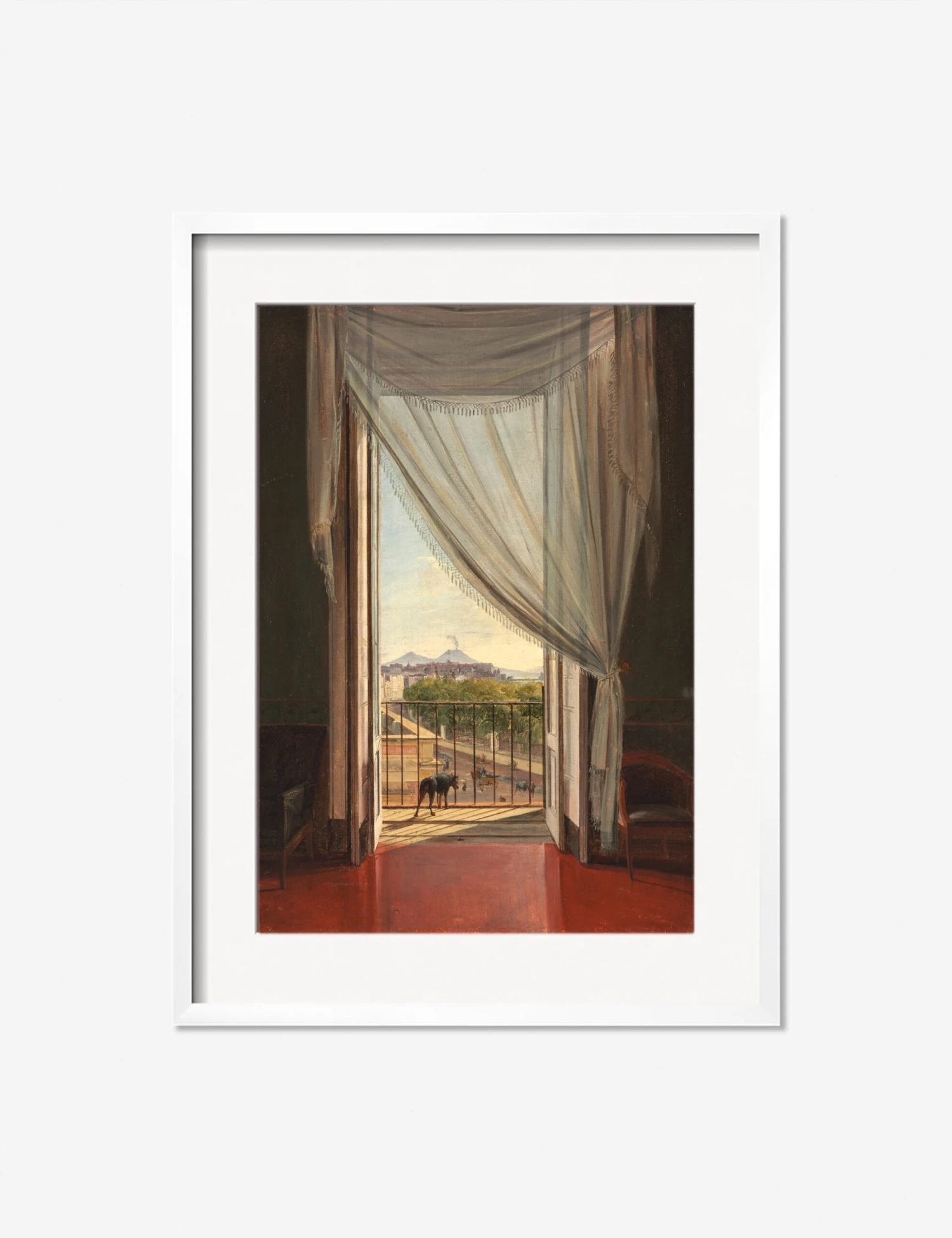 A balcony view opens up to sunlit streets with Mount Vesuvius in the distance, drawing the eye into this oil painting wall print. With its brilliant play of light and perspective, this piece can bring a sense of depth to your wall decor with a masterful touch.