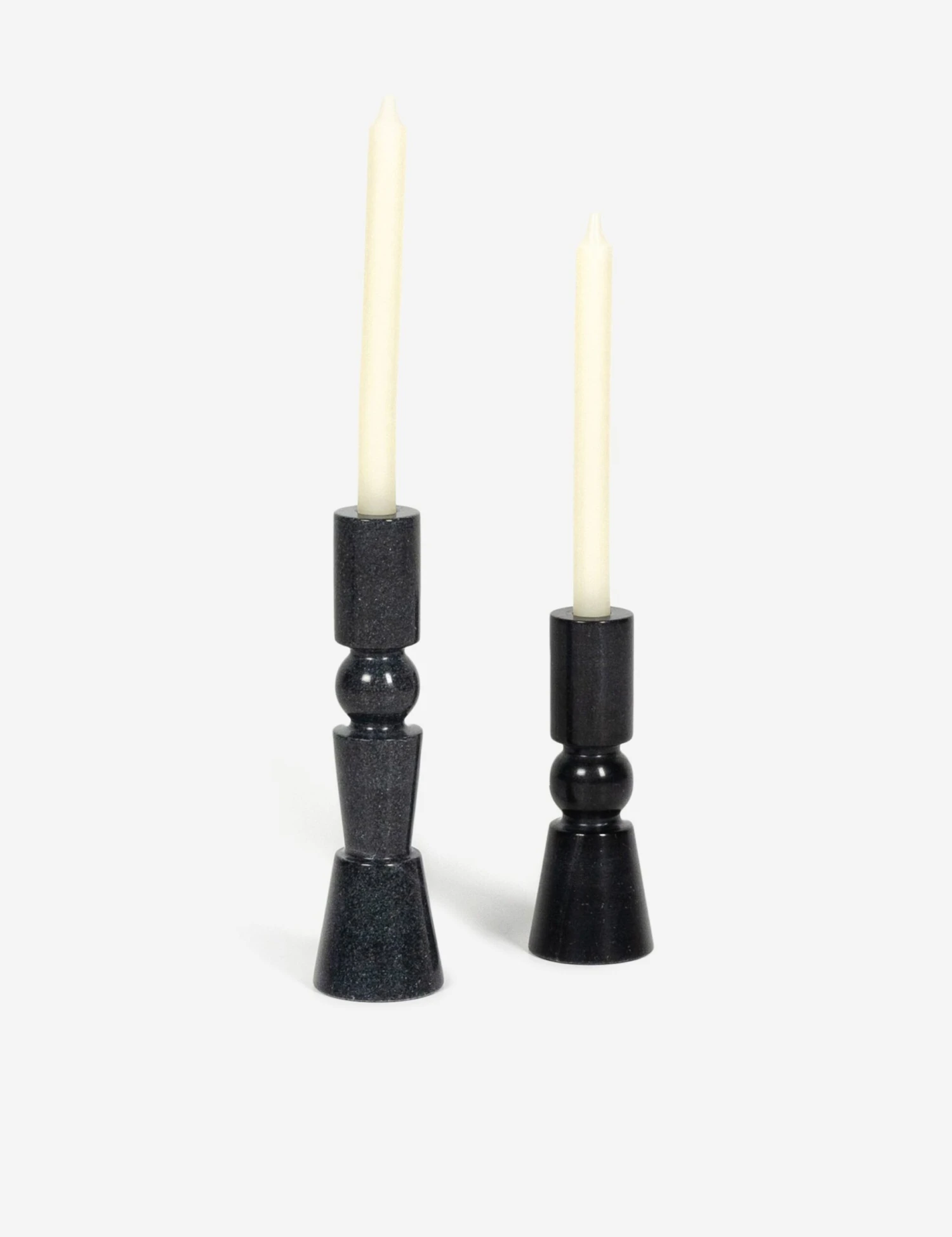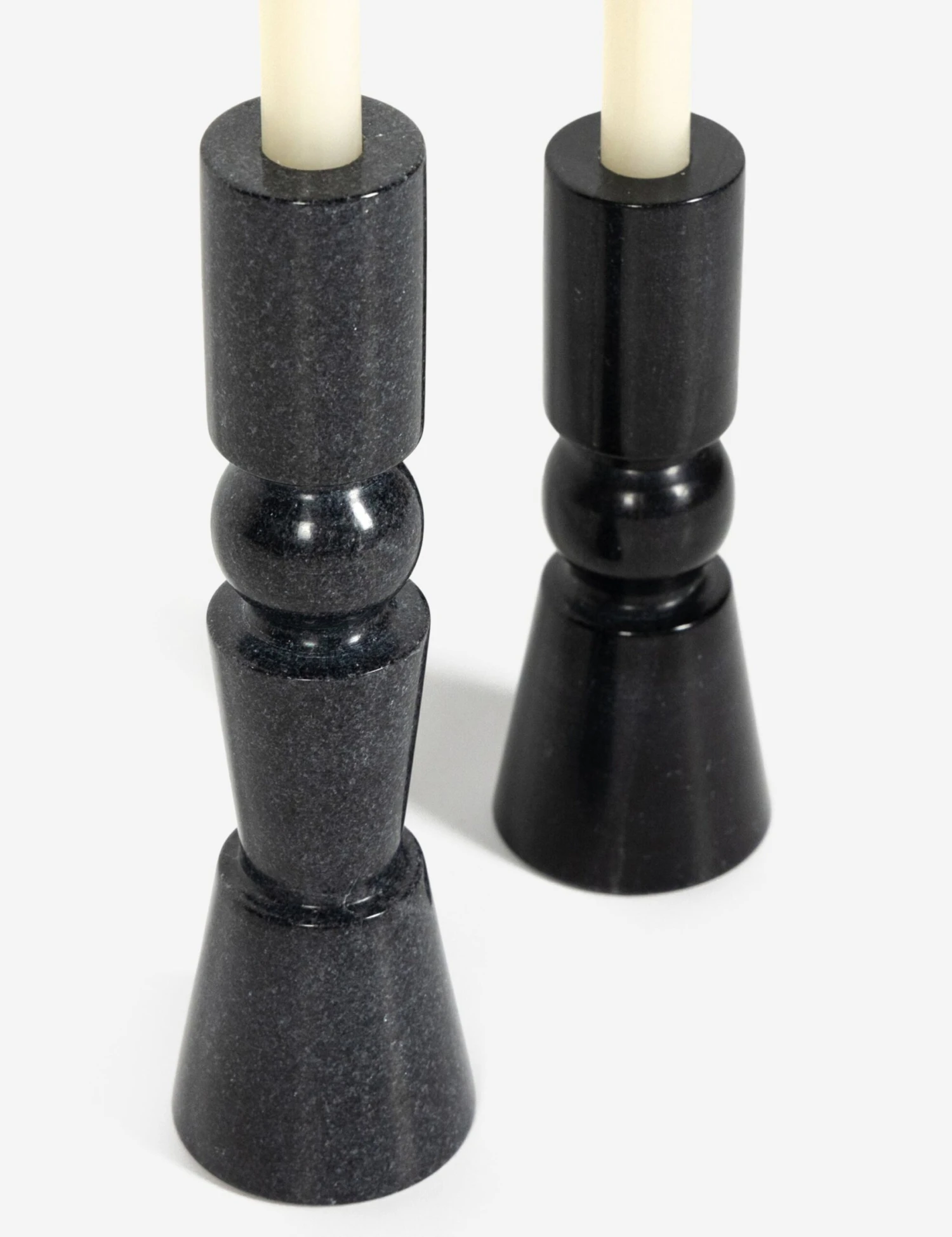 Beautifully carved marble creates a sophisticated yet earthy combination in this set of two candlesticks. Stacked geometric shapes straddle the line between elemental and modern, delivering tailored character on a dining or coffee table. Top them with black taper candles to create a sense of drama, or choose a seasonal color to complete a curated look.