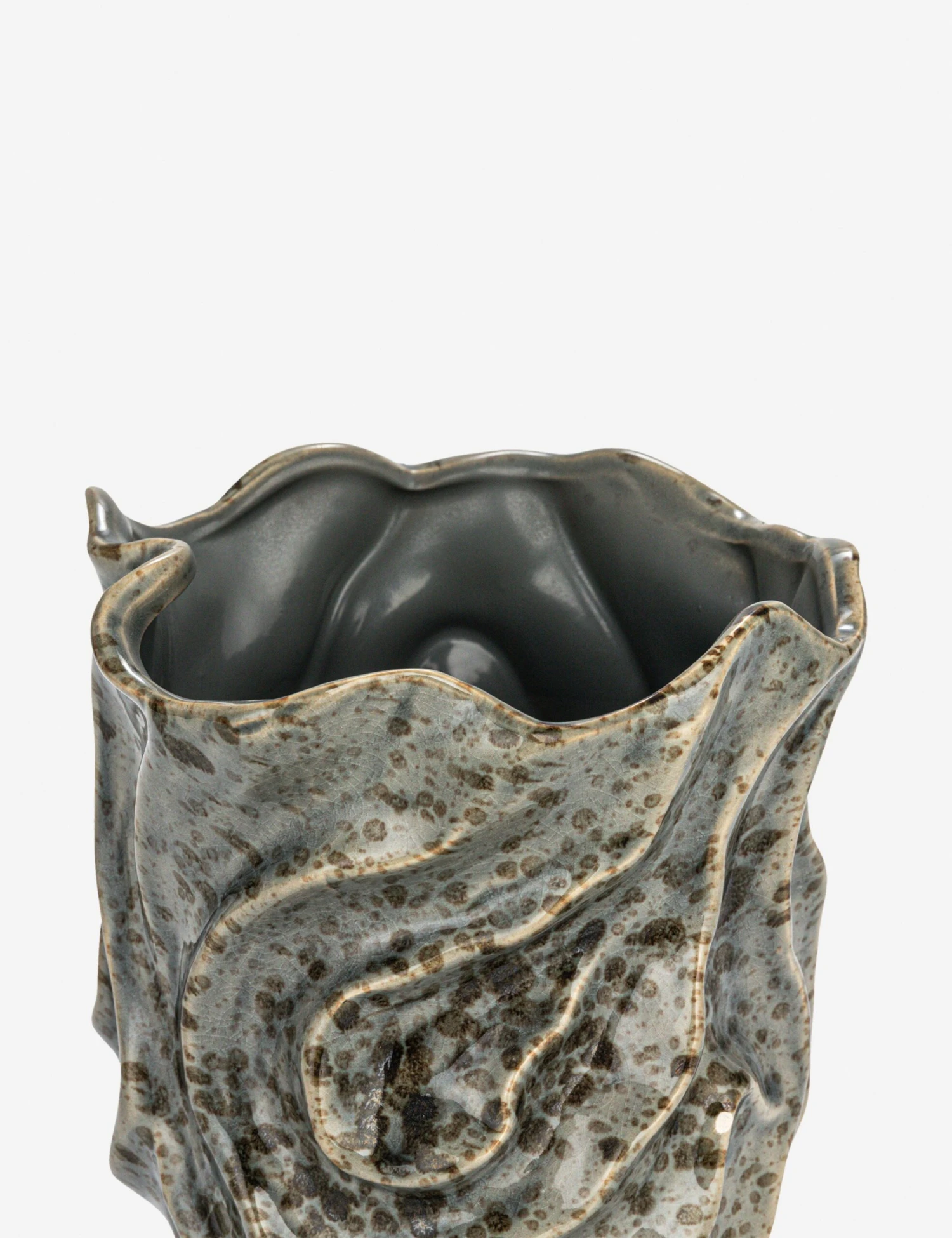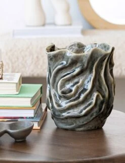 This decorative vase features an organic silhouette and crackled glaze that give it a dramatic, earthy texture. Style this piece on a console or shelf with dried stems or let it stand alone as a modern ceramic accent.
