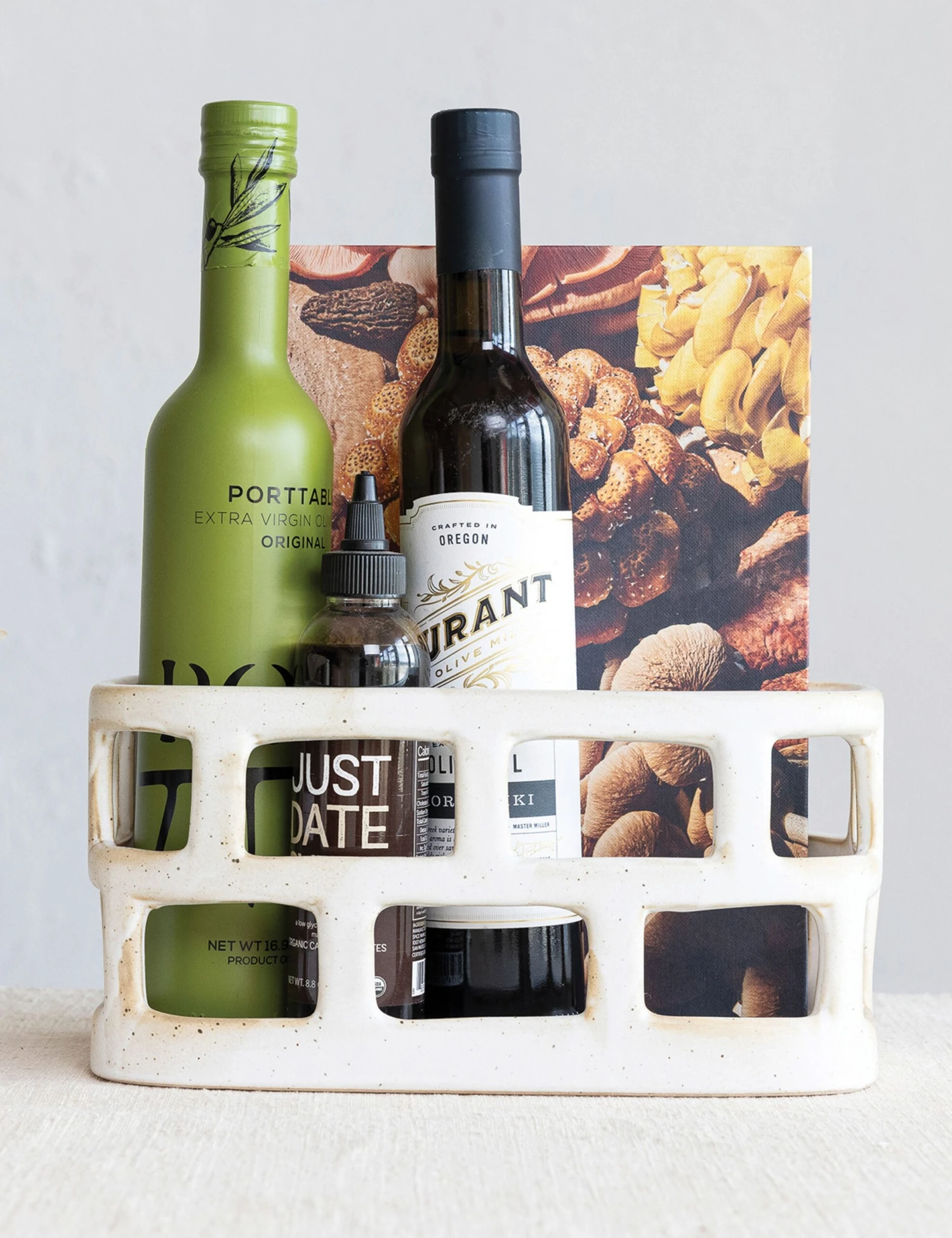 A study in functional artistry, this stoneware basket brings texture and character to your counter or table. A striking display piece for fruits, bread, or other kitchen staples, the basket’s open weave and white finish offer a light and airy addition to any curation.