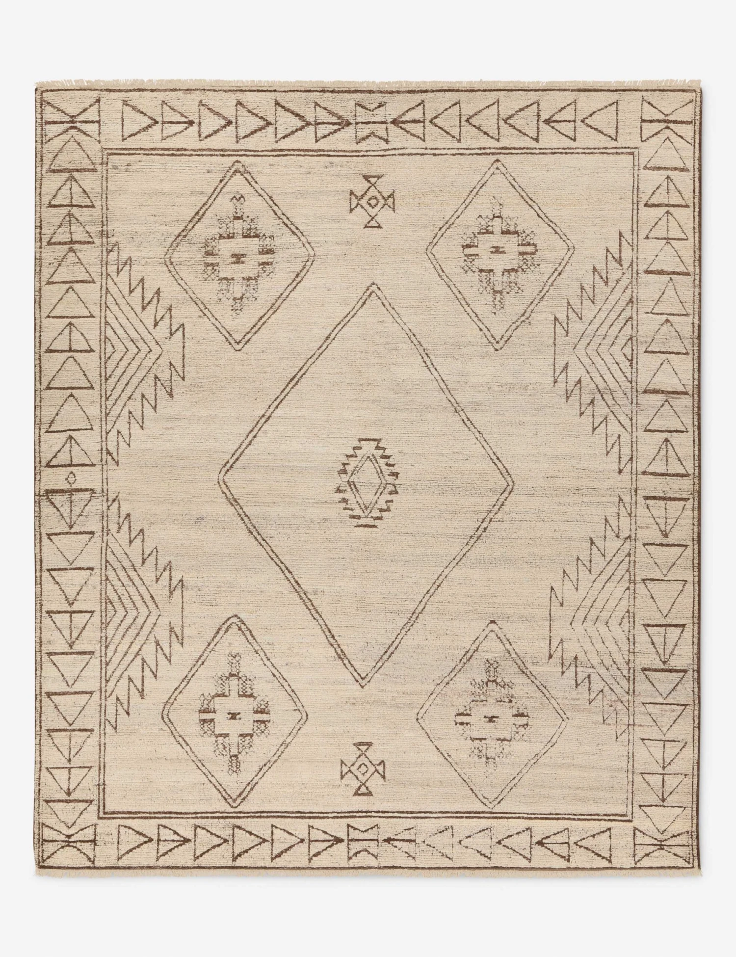 Timeless motifs strike an artful edge in this Moroccan-style rug. The design features an open medallion with a geometric border on a neutral ground. The low wool pile and meticulous hand-knotted construction offer a lasting foundation you can style throughout your home.