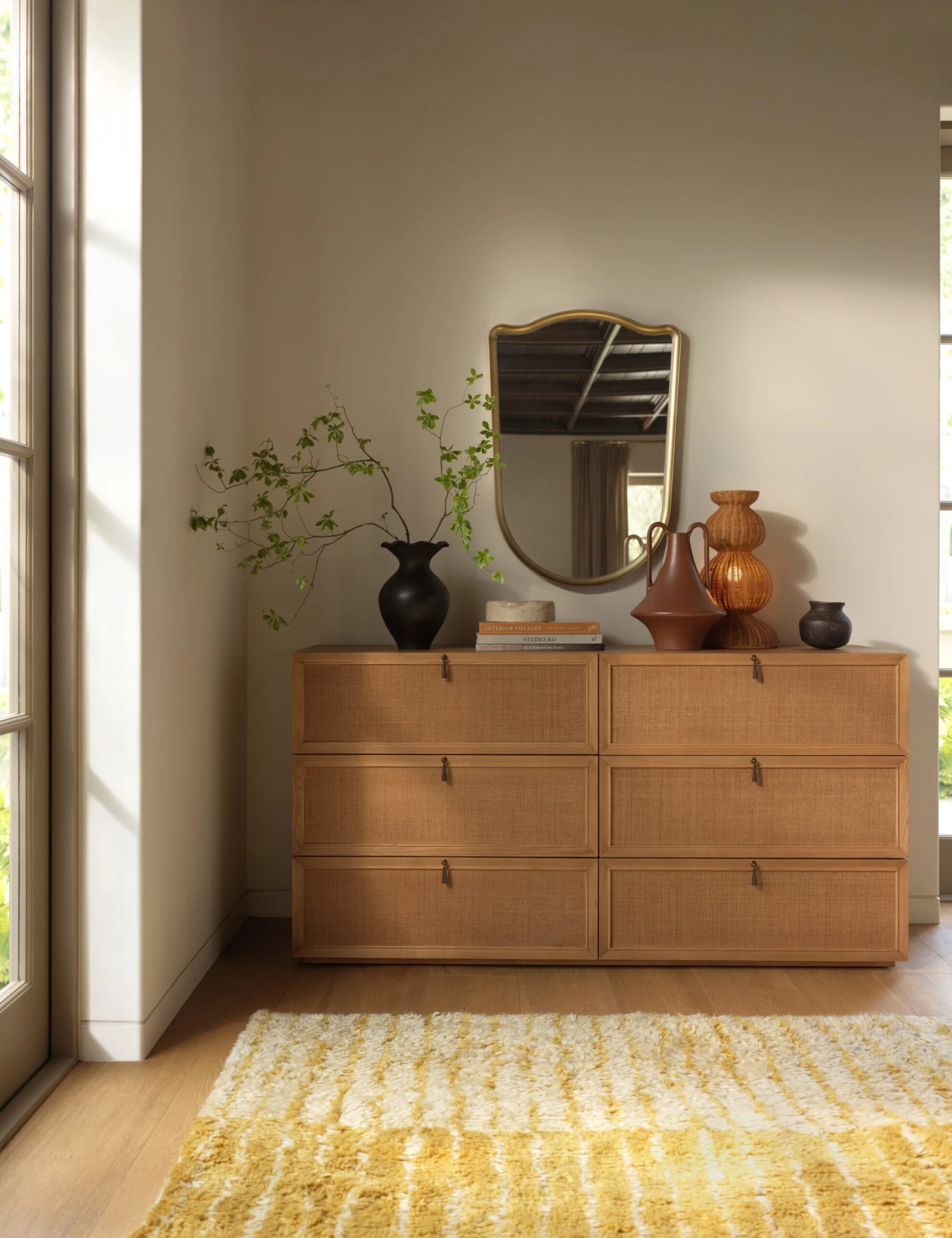 Thick, tactile, and boldly styled, the Bhari rug makes a statement in softness. Its hand-knotted pile offers rich texture with an organic design accented by stripes that add a quiet rhythm. This thick wool rug underpins the room with a sculptural feel and warm foundation.