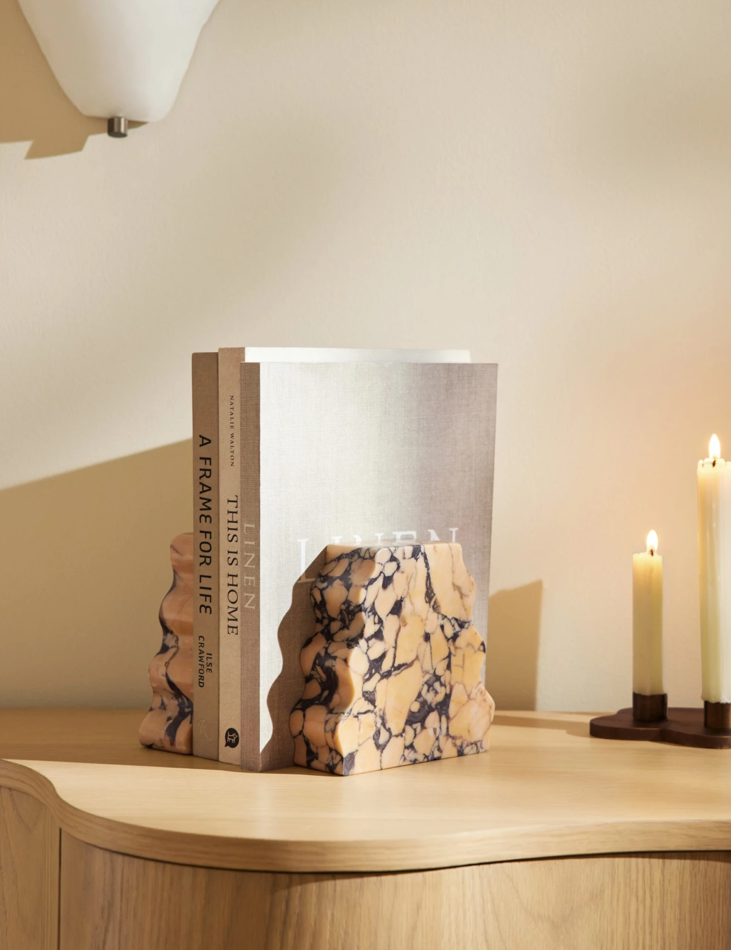 Celebrated for their ceramics and bold designs, Lolly Lolly Ceramics brings their knack for sophistication with a playful edge to an exclusive collection for your entire home. These marble bookends were carved from carefully selected marble to showcase its dramatic veining and coloration. The weight of their solid design ensures they can hold even your heavier books without tipping.