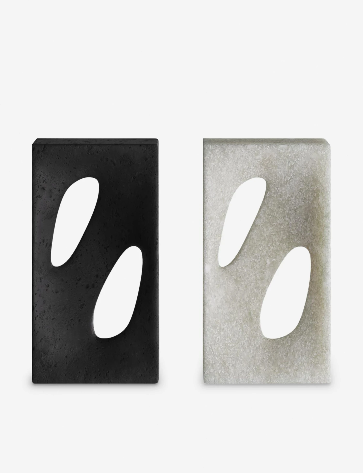 This set of bookends combines modernist sculpture with functional decor. Playing with positive and negative space, each looping bookend creates its own art piece, offering dynamic versatility in a curated bookcase display. The dual black and white finishes create instant impact.