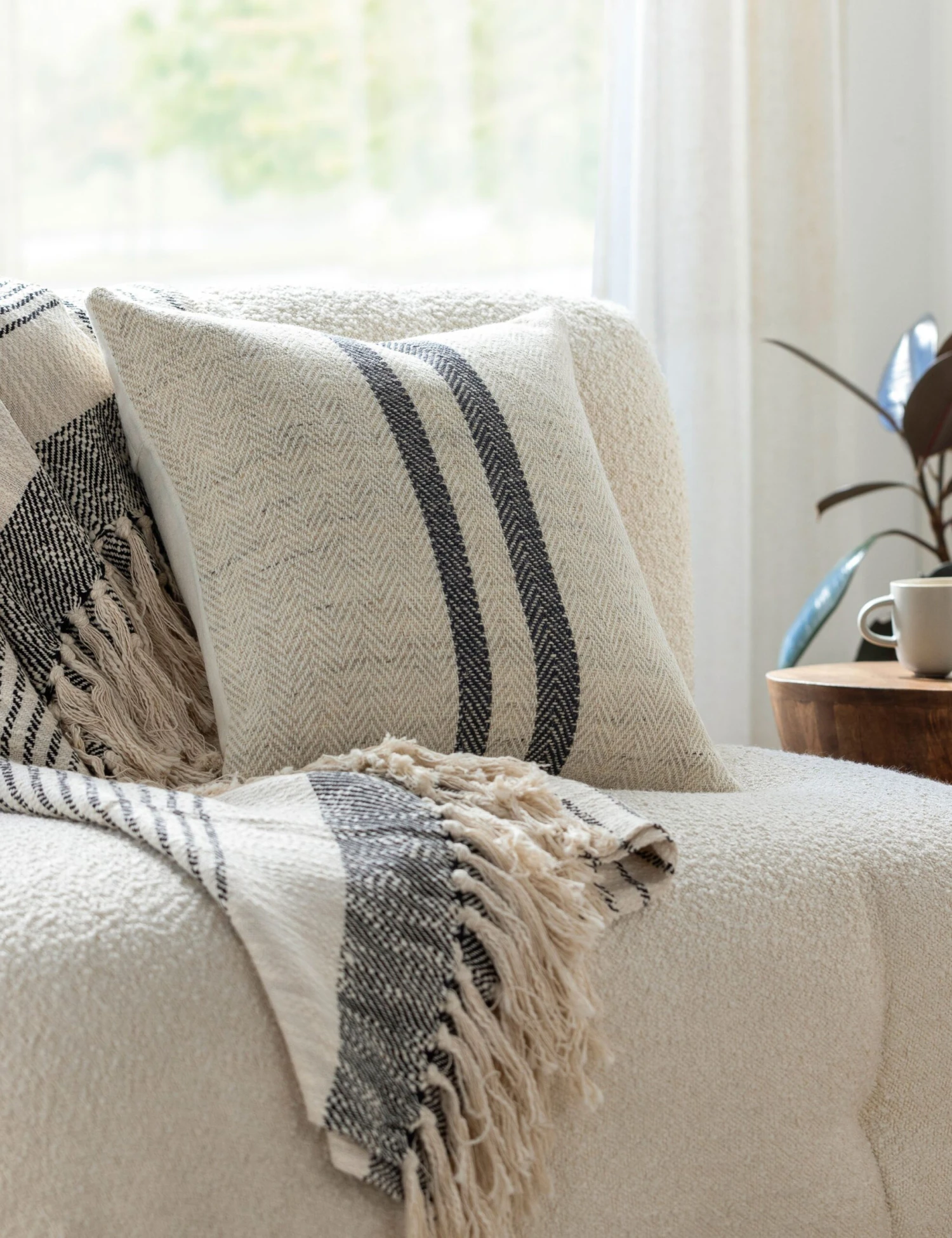 Becki Owens brings her hallmark blend of warmth and elegance to a collection of throw pillows with Surya. We love the natural woolen touch this accent pillow adds to the room. Its minimalist design features two stripes on a neutral field for subtle impact.