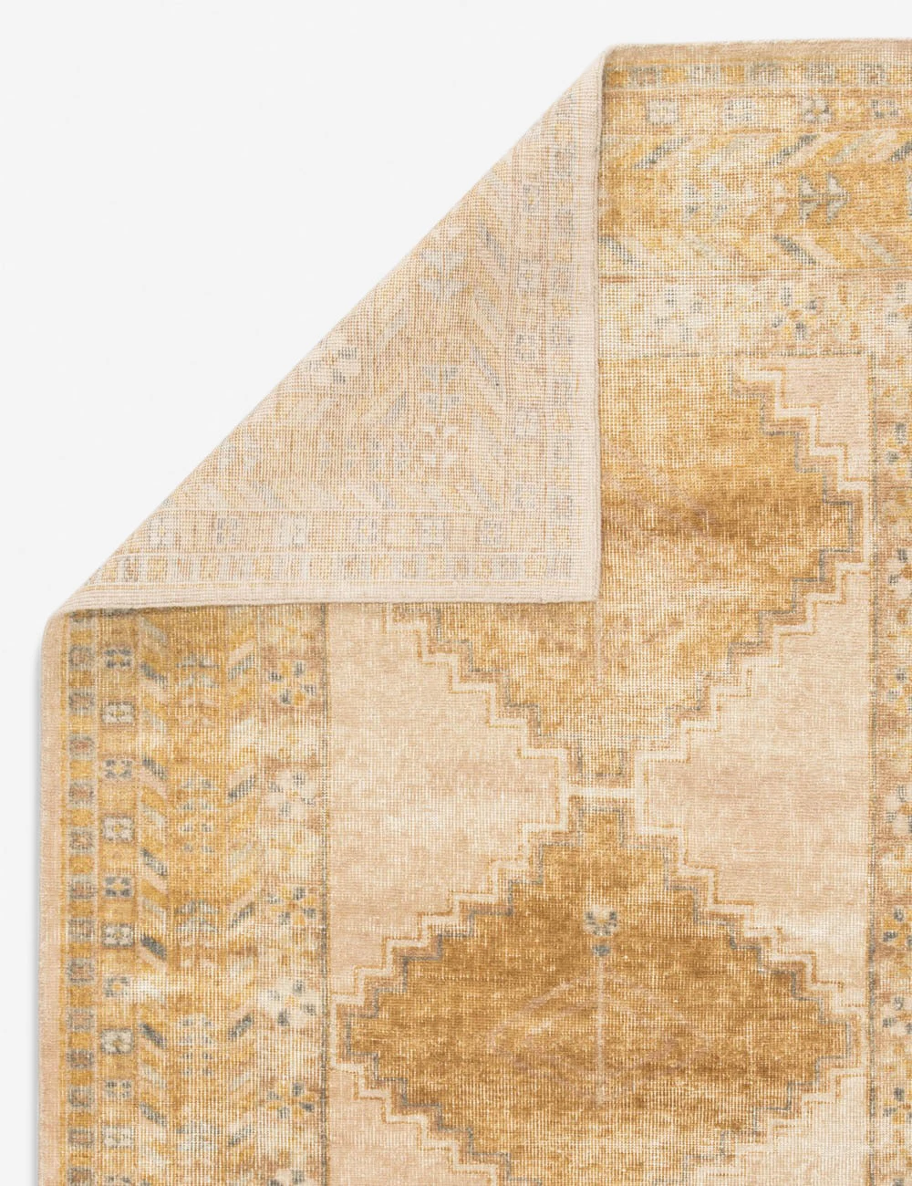 Golden-orange tones and an ornate border design on this area rug make it an instant conversation starter. Hand knotted from wool, this rug’s subtle distressing lends a vivid and vintage-inspired look for any lounge or bedroom.