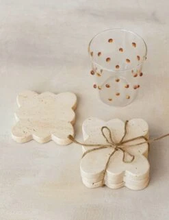 Scalloped edges and natural travertine give this set of coasters an artisanal, old-world charm. Stack them on a coffee table or bar for a subtle touch of timeless texture.