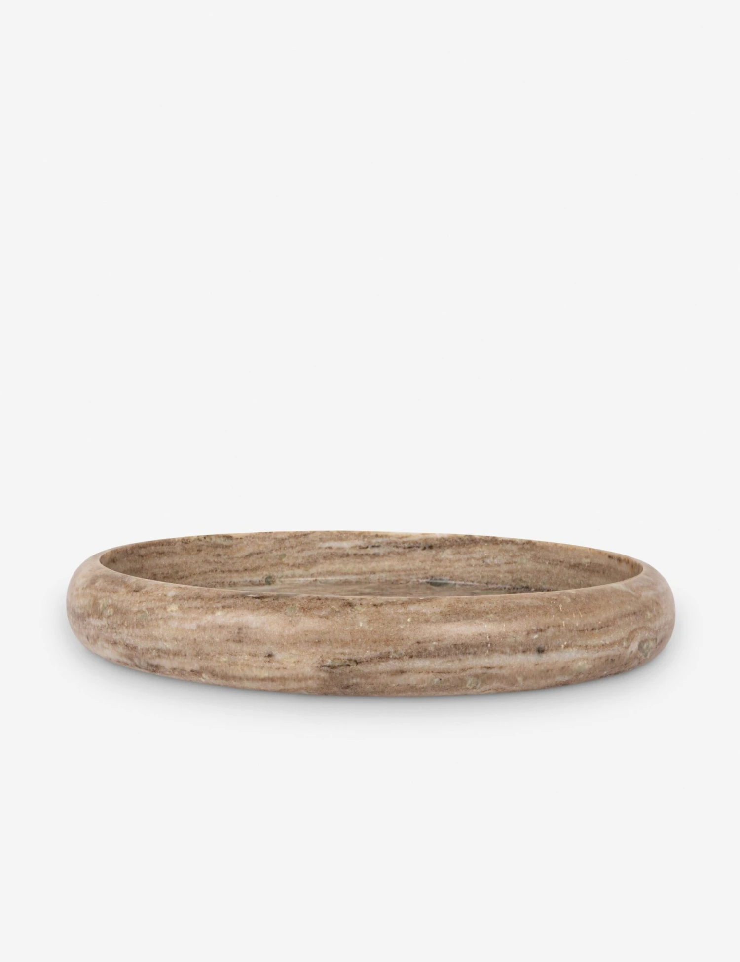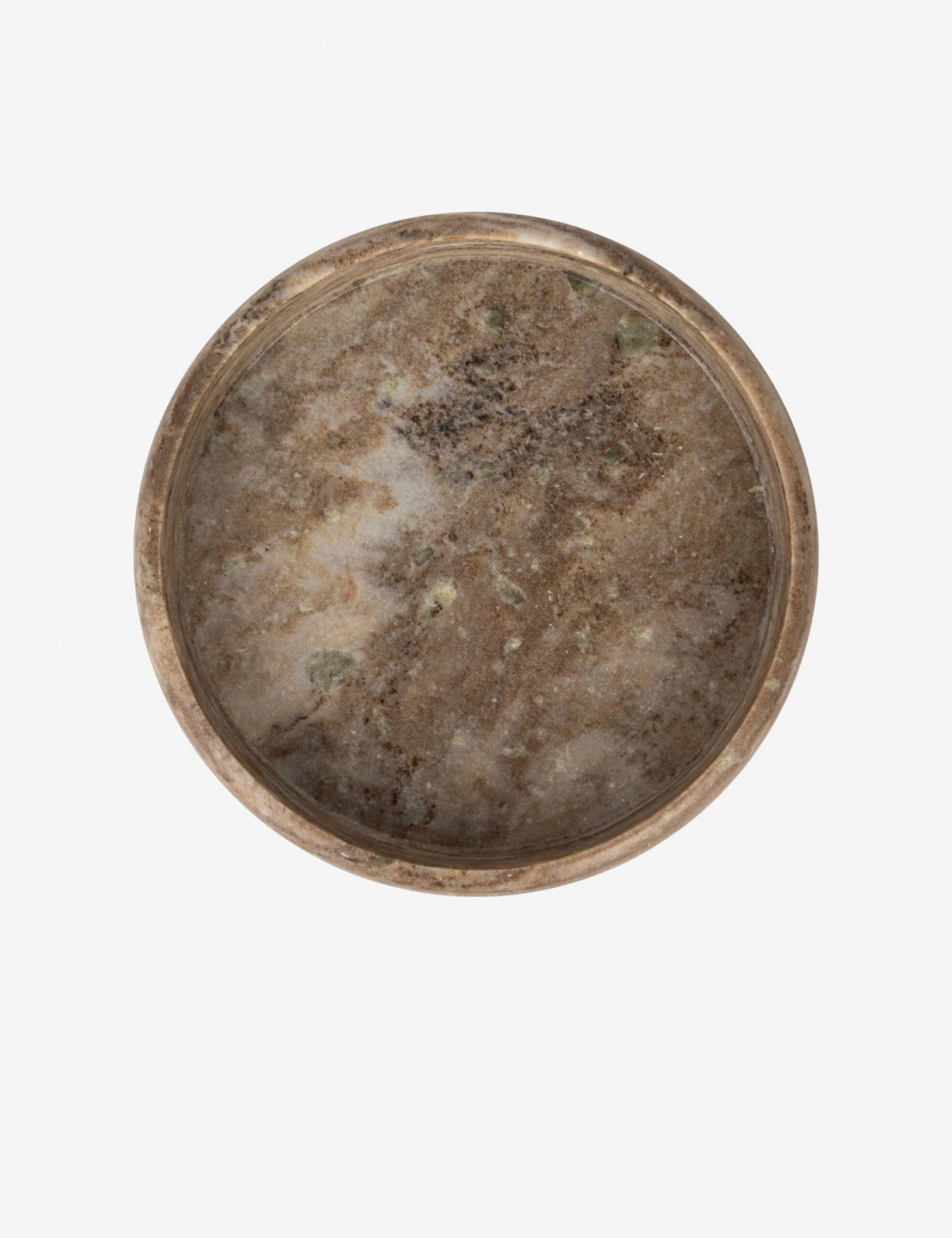 Carved from solid marble, this round tray showcases the natural mineral patterns in the stone. Perfect for layering candles, glassware, or collected objects on a coffee table or vanity.