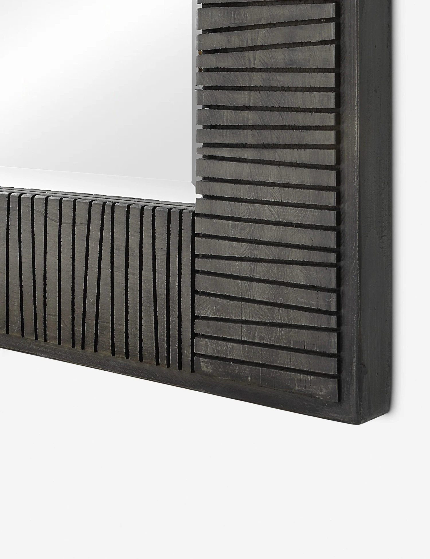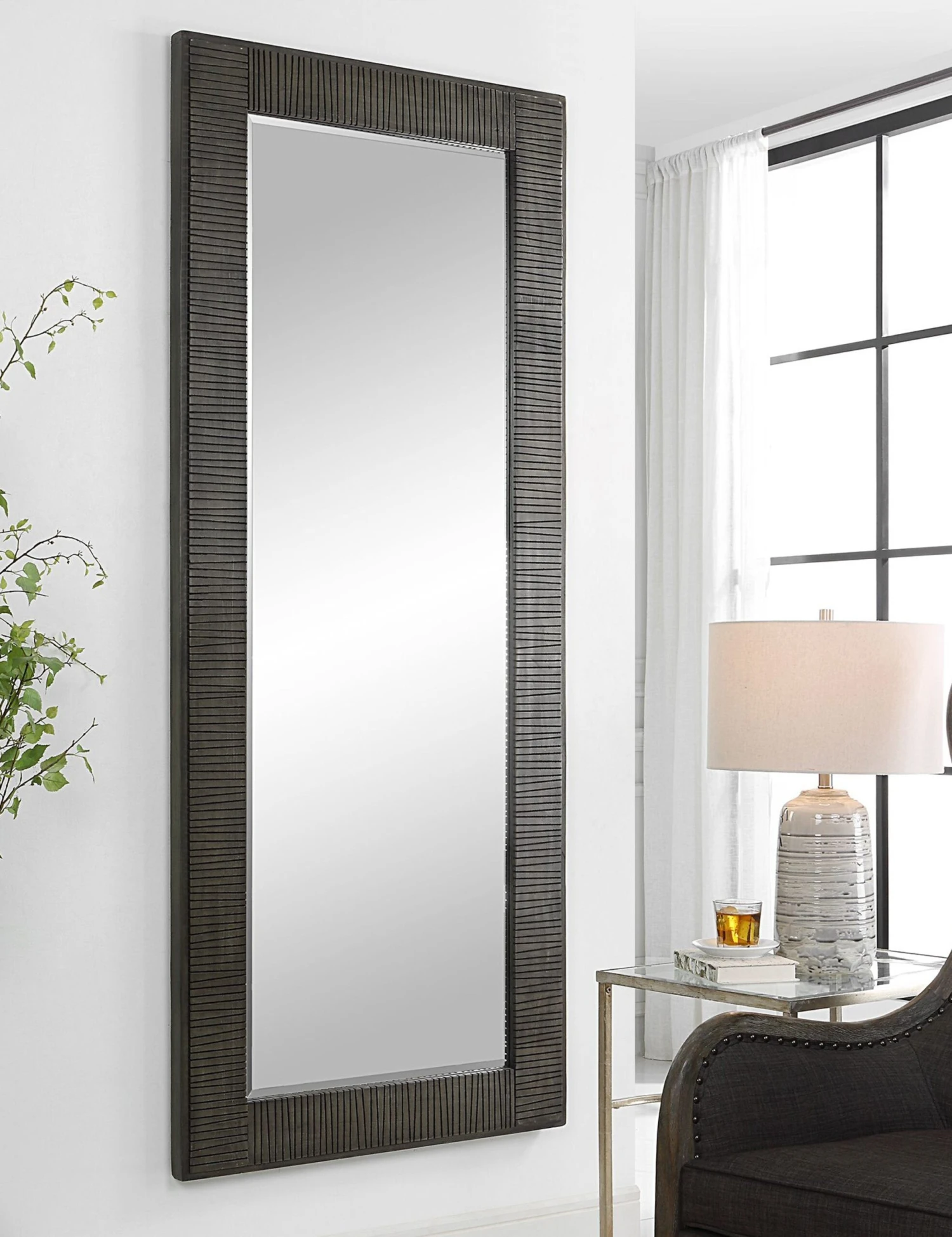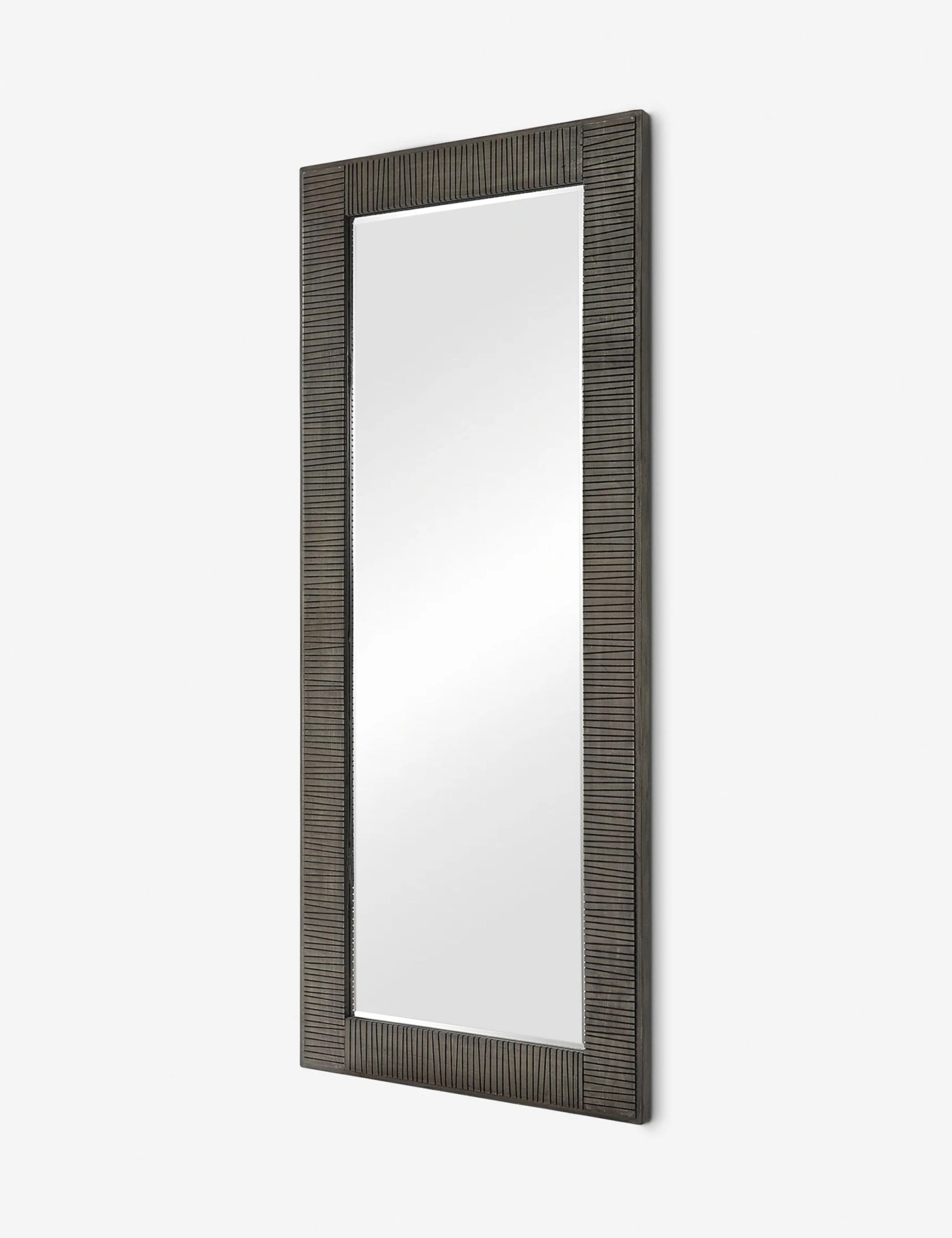 Hand-carved channels bring a striking textural look to this oversized full-length mirror. Its gray wash on wood offers a rustic warmth to the modern design, styling the perfect decorative mirror for a transitional entryway or living room.