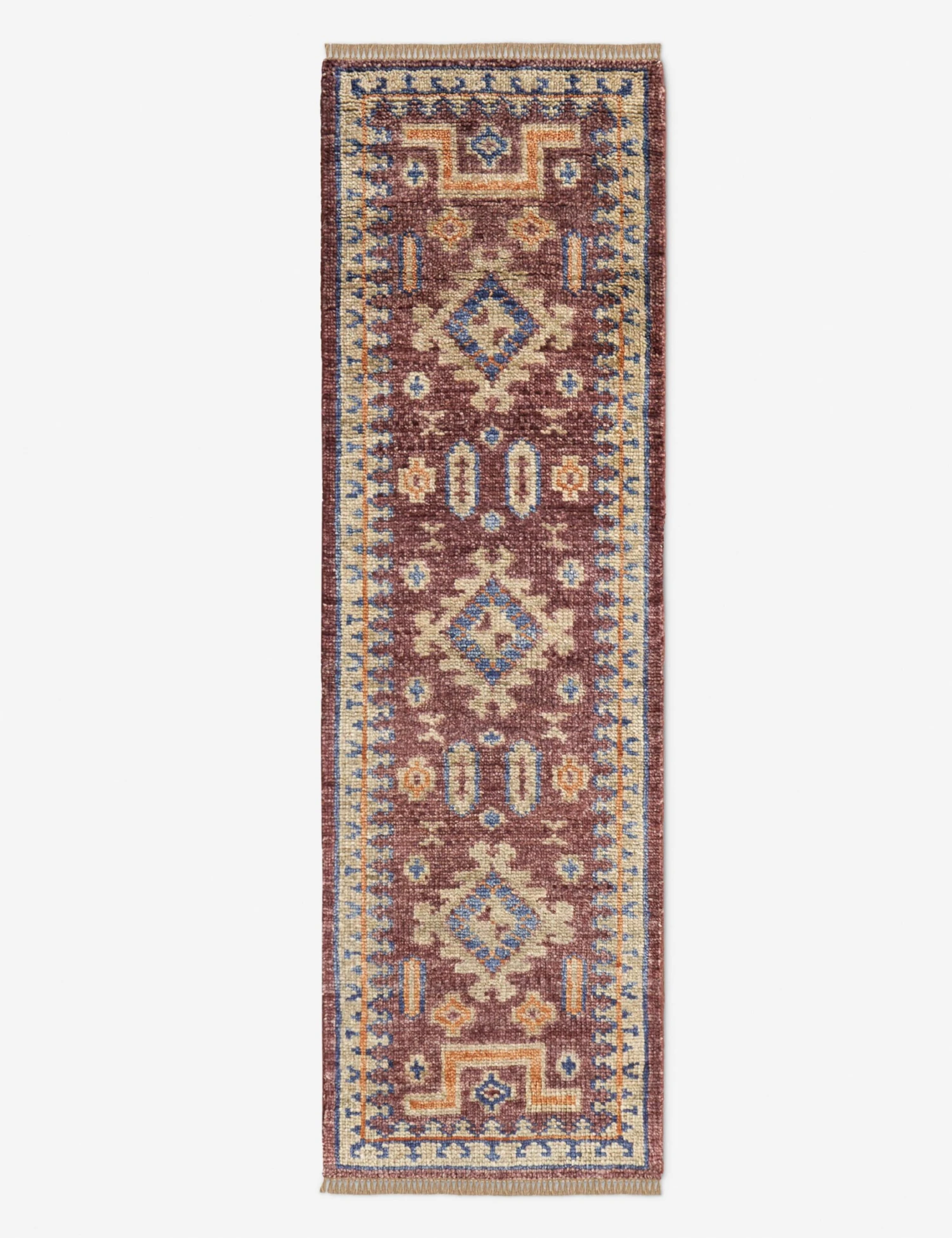 Set a timeless foundation for transitional style with this modern take on the medallion rug. Its wool fibers create a thick pile underfoot in a rich palette of red and blue. This hand-knotted rug offers an heirloom quality piece you can style throughout your home.