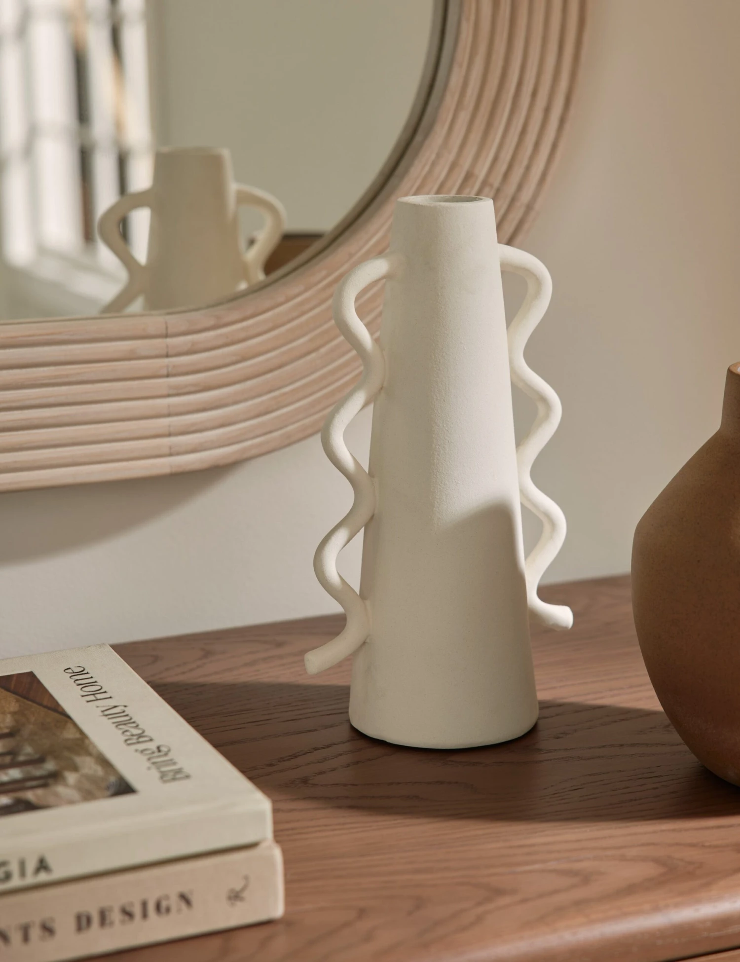 Sleek and slender with a playful edge, our Cyrene vase is the perfect addition to a modern space. Its wavy coil handles cut a unique silhouette that will catch the eye in any grouping. The white finish makes this piece easy to mix and match with other favorite decor pieces.