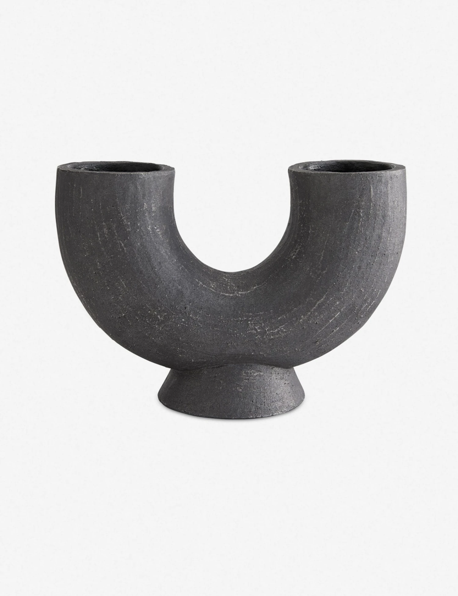 This half-circle table sculpture vase makes a modern statement with its tubular form and matte black glaze. This textural terra cotta vessel is a stunning addition to any console, coffee table, or home office.