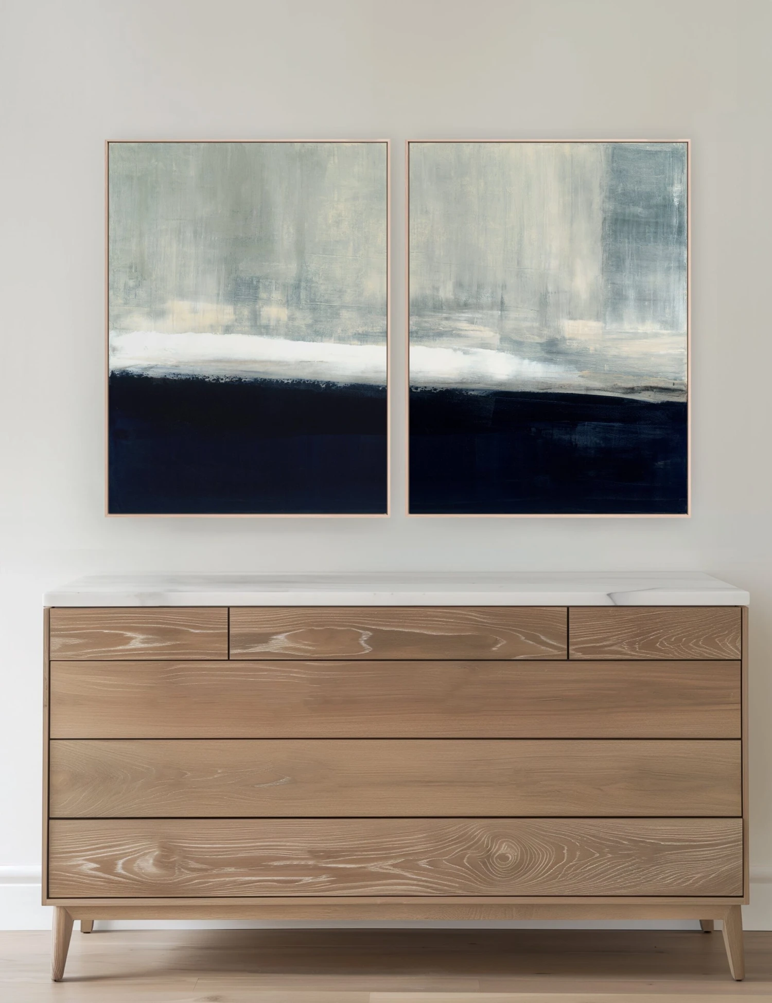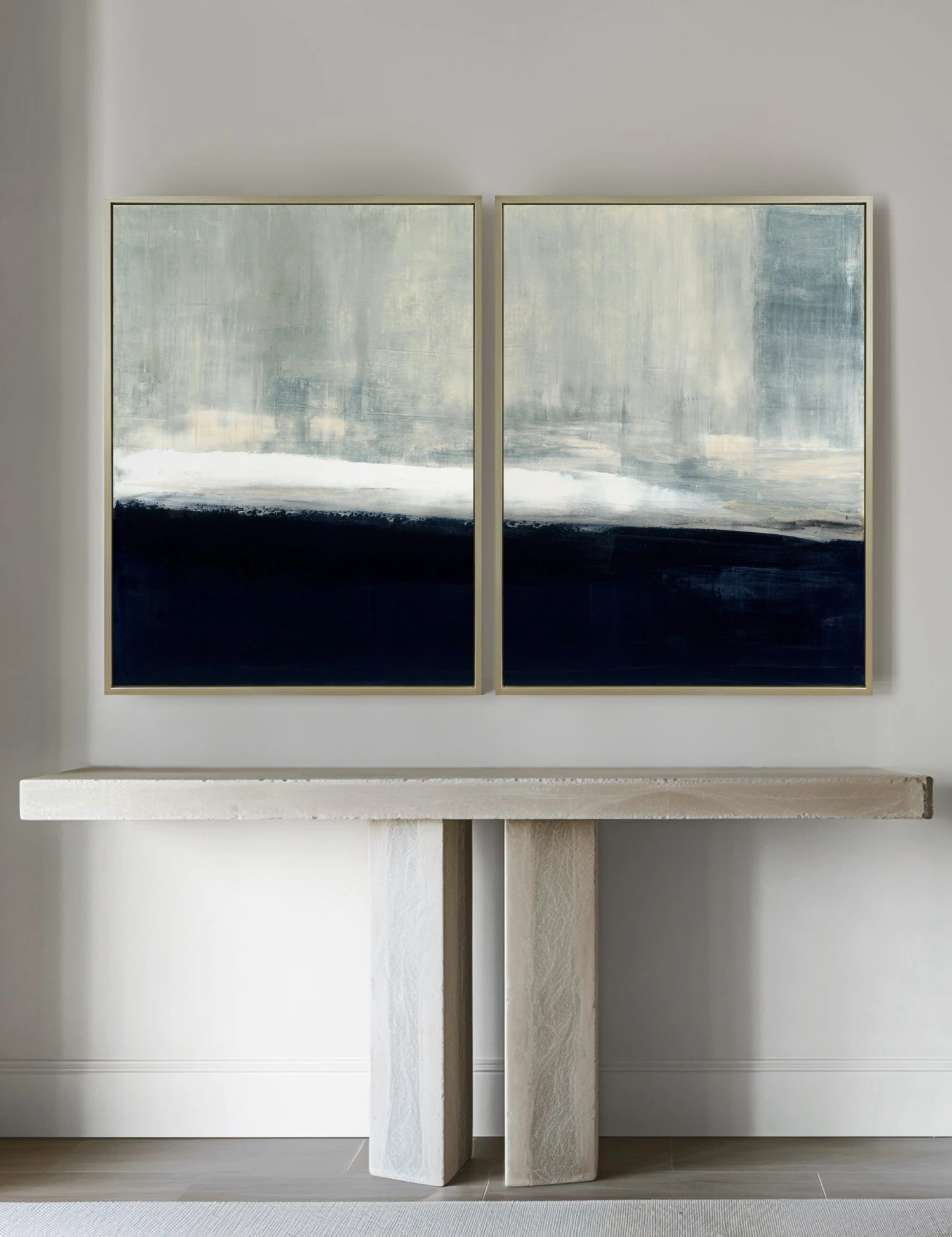 Soft tones hang over a bold horizon in this abstract wall art by Carol Benson-Cobb. The contrast creates a strong visual impact, making it the perfect focal point for elevated wall decor. Set off a well-grounded edit by mounting this diptych so its striking effect is the first impression you get from the space.