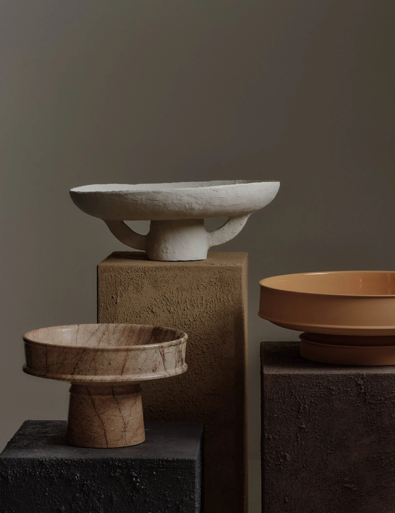 This paper mache pedestal plate brings sculptural impact to any surface with its wide, shallow form and bold, double-handled base. The hand-shaped design and textural finish lend an earthy feel, offering an artful accent whether styled solo or layered into a larger vignette.