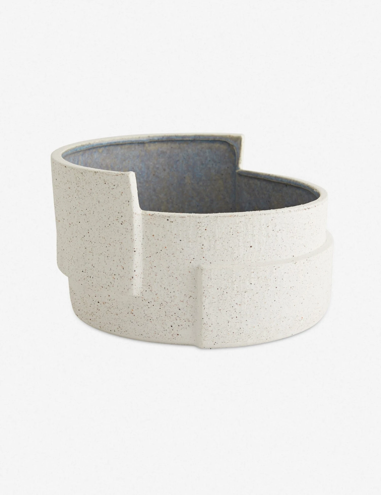 Architectural and tactile, this ceramic centerpiece is inspired by the crafts and fine arts elements of the Bauhaus movement. Its asymmetrical silhouette features a textural white sand infused finish on the outside and an arctic blue reactive glaze on its interior. Place this decorative piece on your dining table, coffee table, or a console.