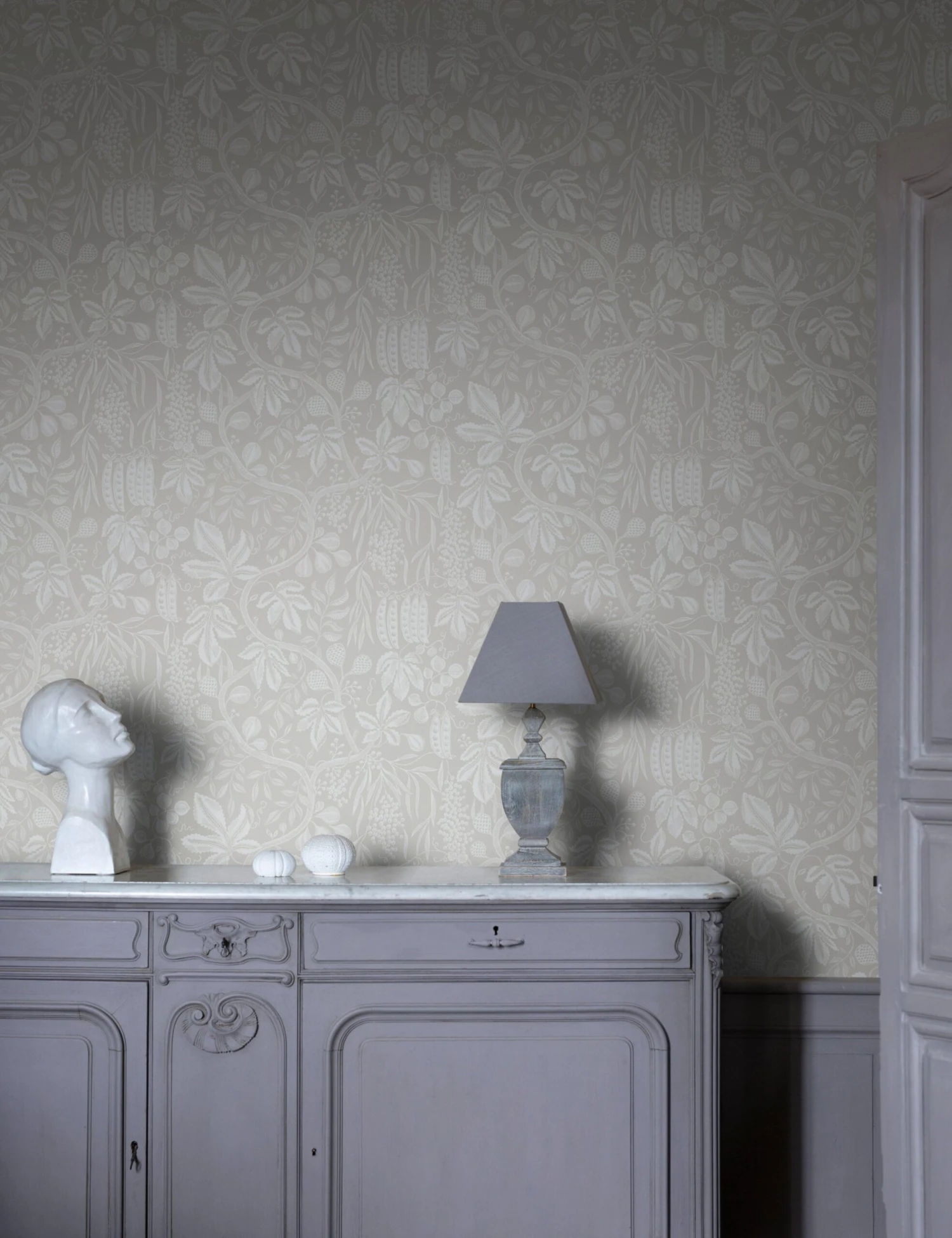 Bring the elegance of the French countryside to your walls with this botanical wallpaper. The design is inspired by the bunches of violet-blushed figs that grow plump in the sunlight among grapes and peas. The intricate pattern and striking modern palette make a beautiful backdrop from entryway or living room to bedroom or bath.