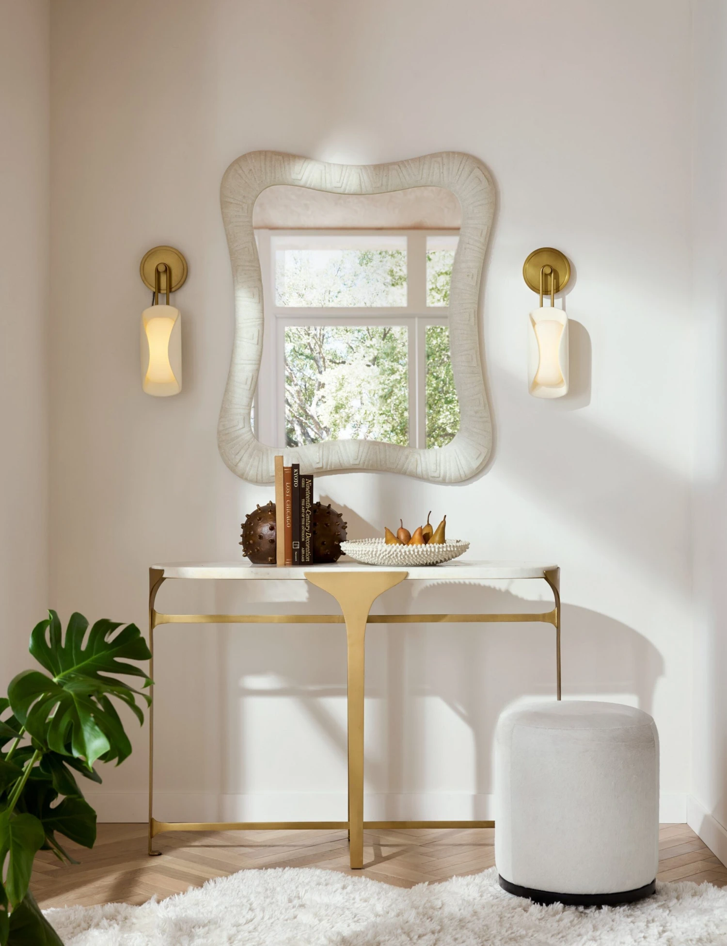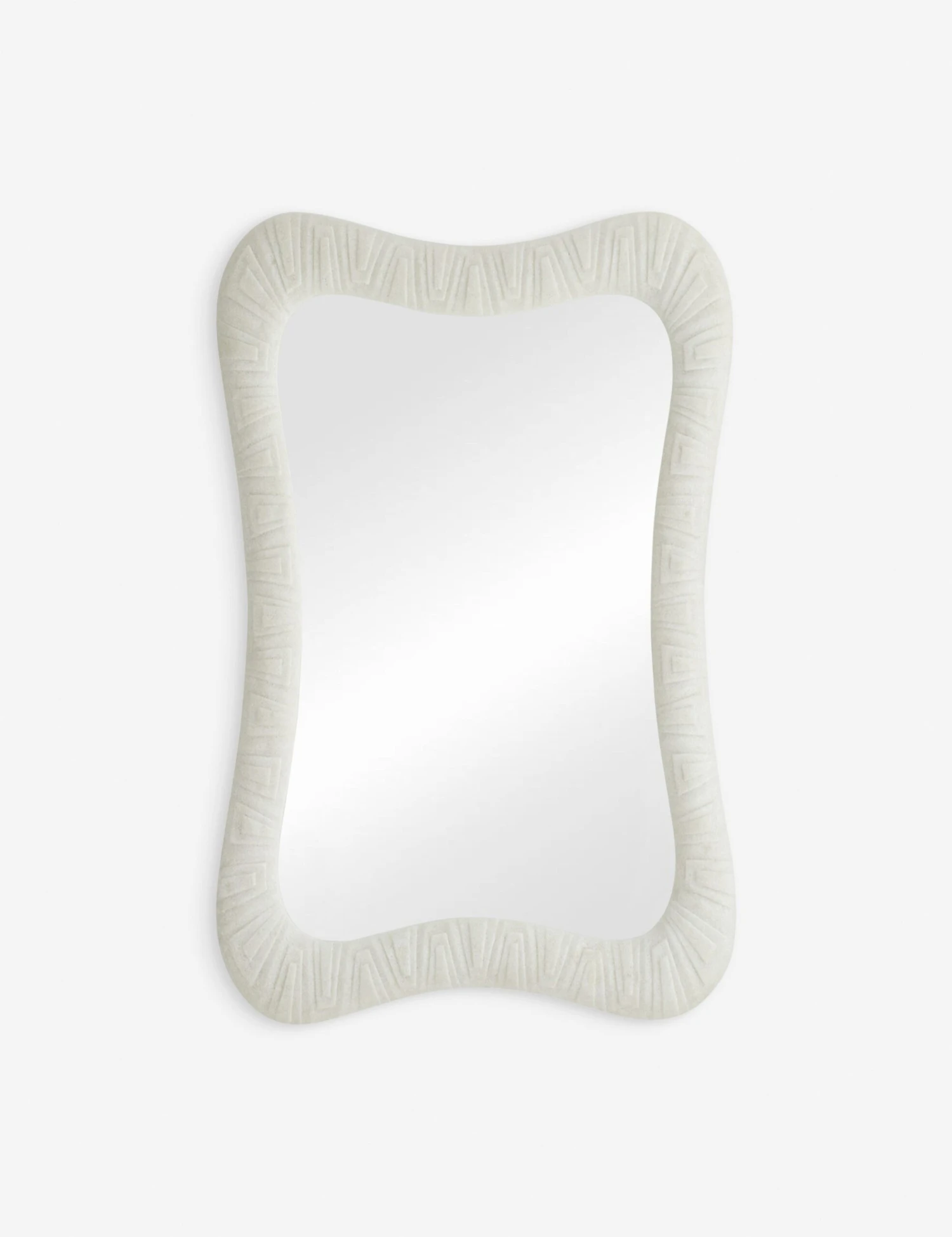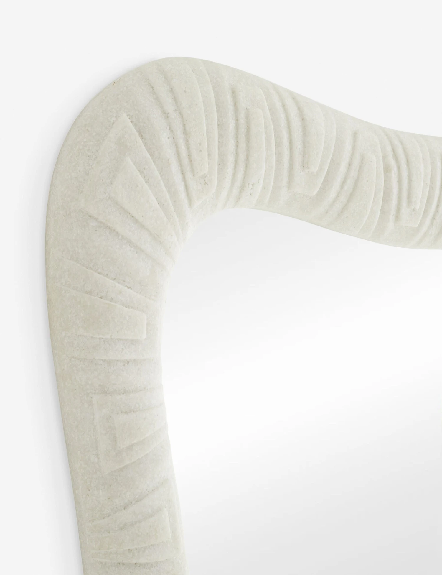 A concave form gives the Fuller mirror its sculptural edge. Rhythmic grooves on the white frame catch light and shadow, bringing a subtle texture to the modern form. Generously scaled, this large wall mirror makes a soft, geometric statement above a console, dresser, or mantel.