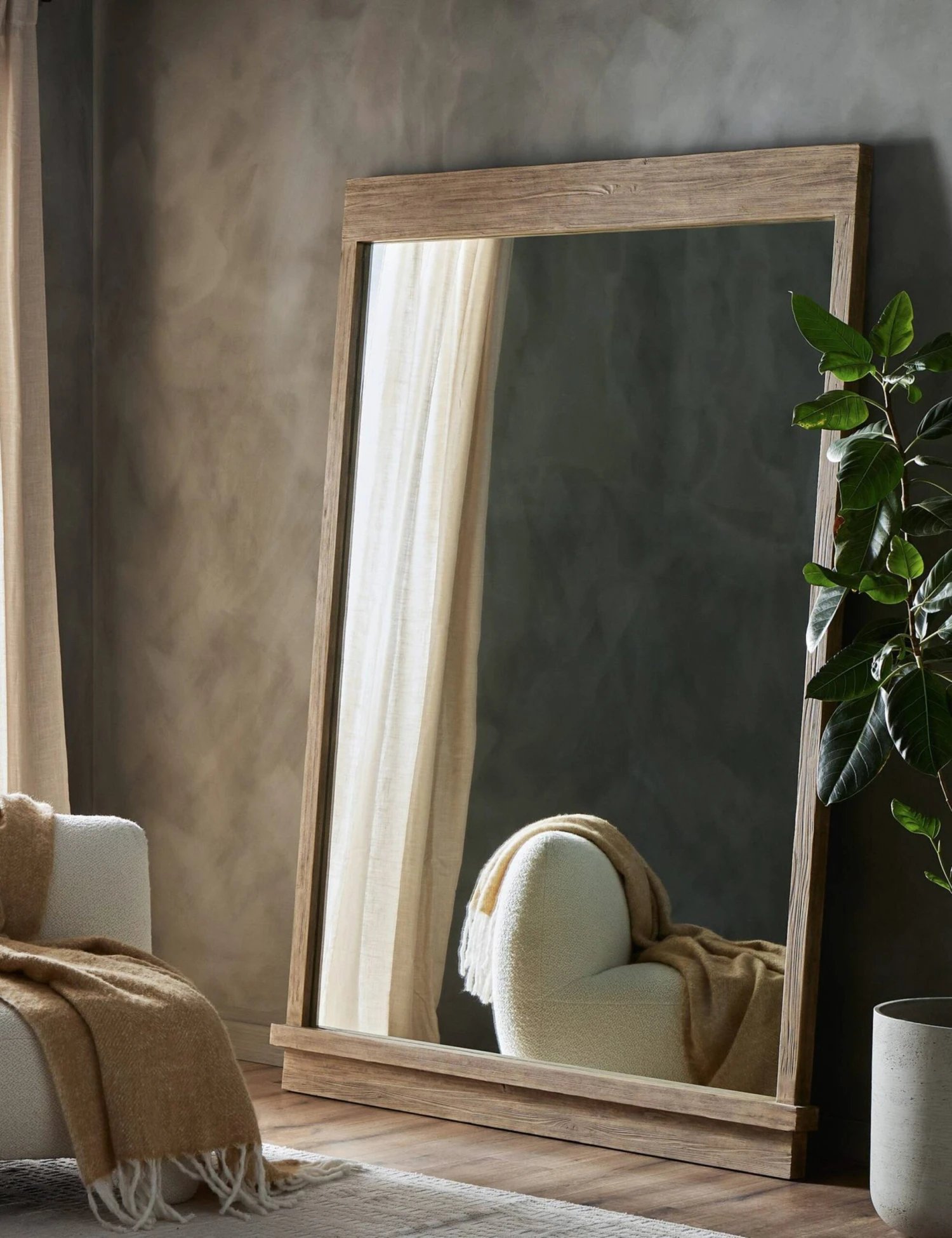 The Hadfield floor mirror showcases the elegance in simplicity. Its wide-format design opens up the room, augmenting light and imbuing a sense of depth. The distressed pine frame features a ledge detail along the bottom, grounding this mirror with a timeless character perfect for transitional decor.
