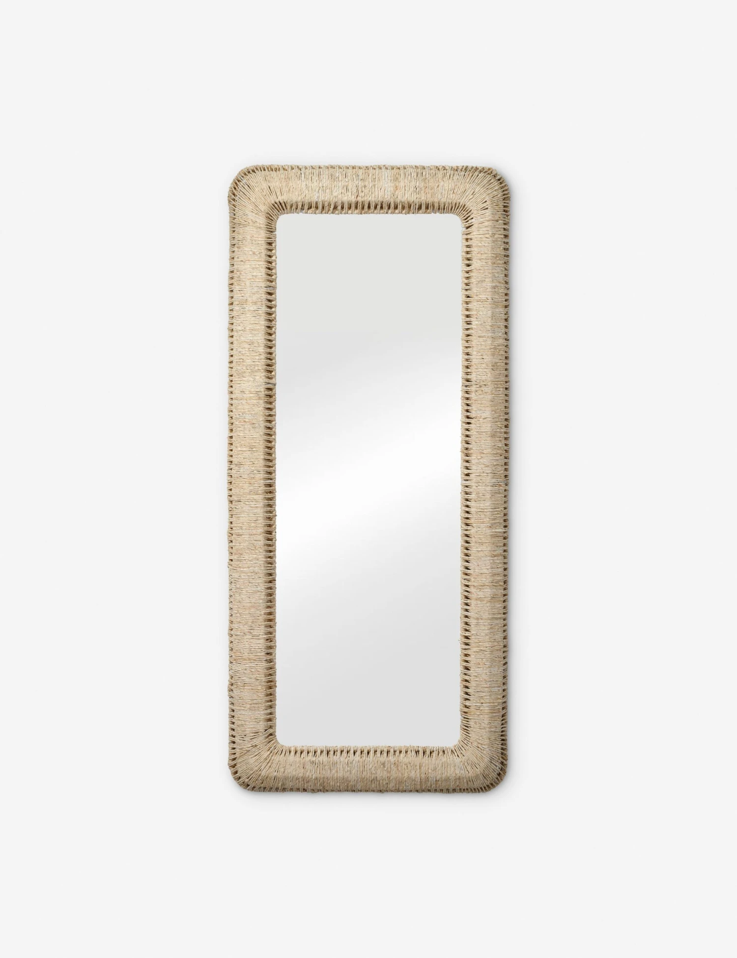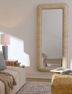 The Halina floor mirror pairs bold scale with artisan texture. Wrapped in rope made from natural corn straw, its rounded-edge frame brings warmth and dimension to your space with an organic touch. Style it in a bedroom, entryway, or living area to reflect light and transform the space.