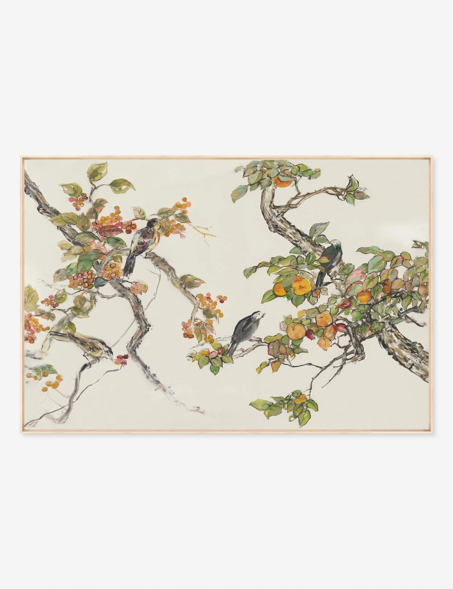 Bring a fresh note to your wall decor with this piece by Maelani Blue. The artwork features birds perched among fruit and foliage teeming with color. We love how the delicate details pop against the minimalist backdrop.
