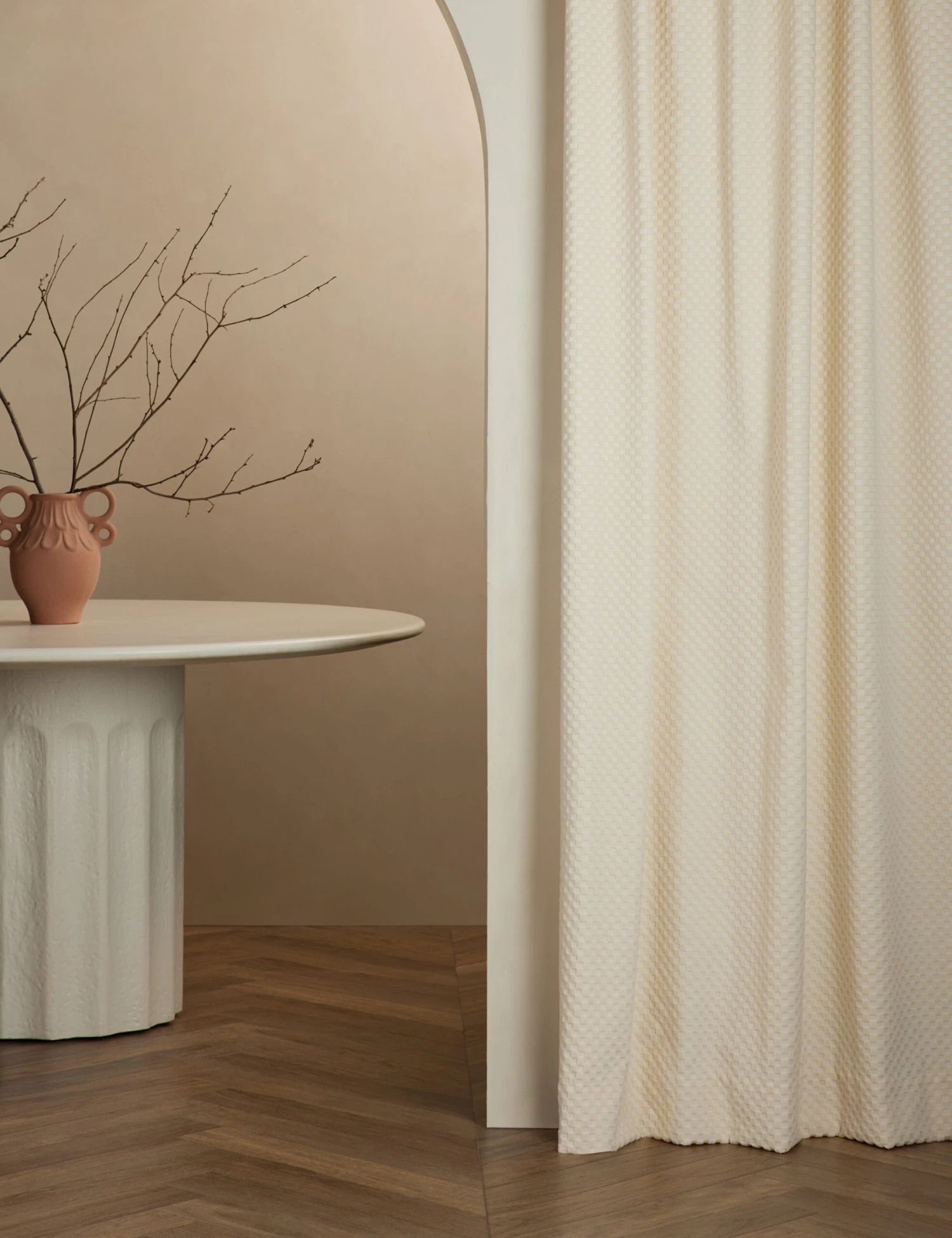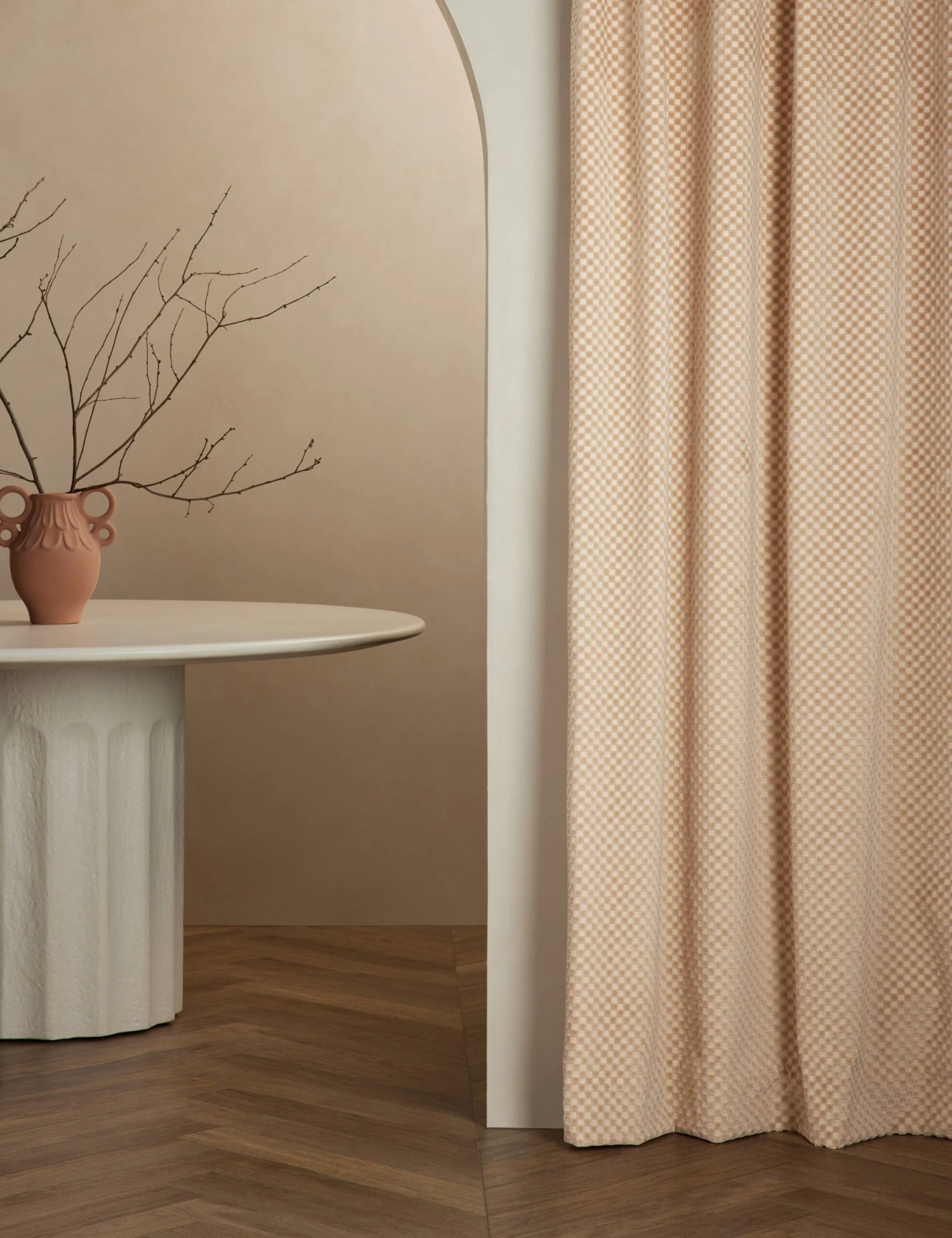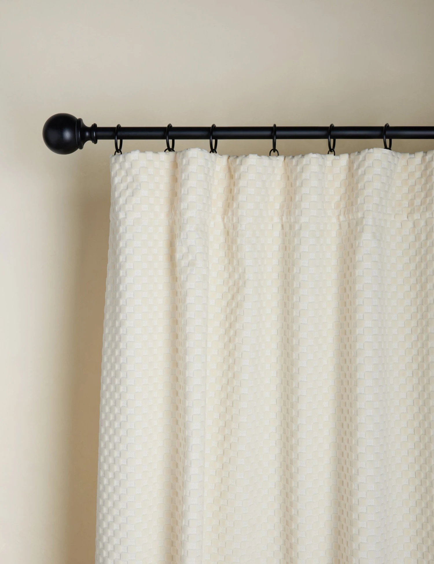 This velvet curtain design brings a fresh touch of style to the room. Its textural high-low checker pattern offers tactile appeal with a luxurious drape. This window treatment is from our exclusive Sarah Sherman Samuel collaboration and features all the trademarks of her warm, edited style.
