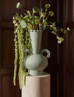 In this exclusive collection, Aimee Song brings her beloved fashion sense home with artful elements designed for living. The Idra vase folds diverse influences into a modern form, drawing inspiration from the Mediterranean to East Asia. Its bold silhouette and refined details create a statement piece that feels distinctive yet versatile—perfect for a thoughtfully curated vignette. Style alone as a sculptural moment or with seasonal branches. Ceramic can be delicate—always lift and support from the base when moving.