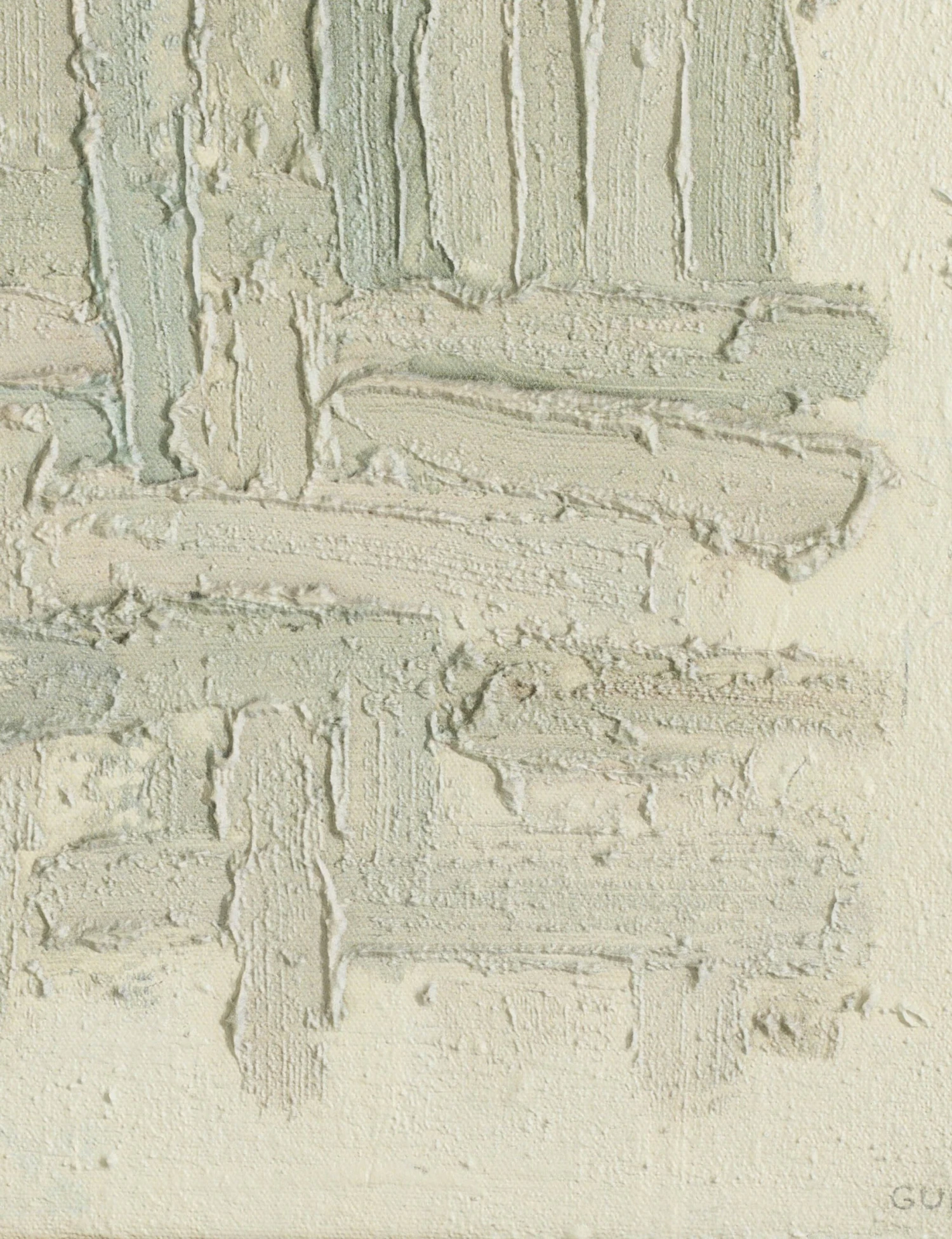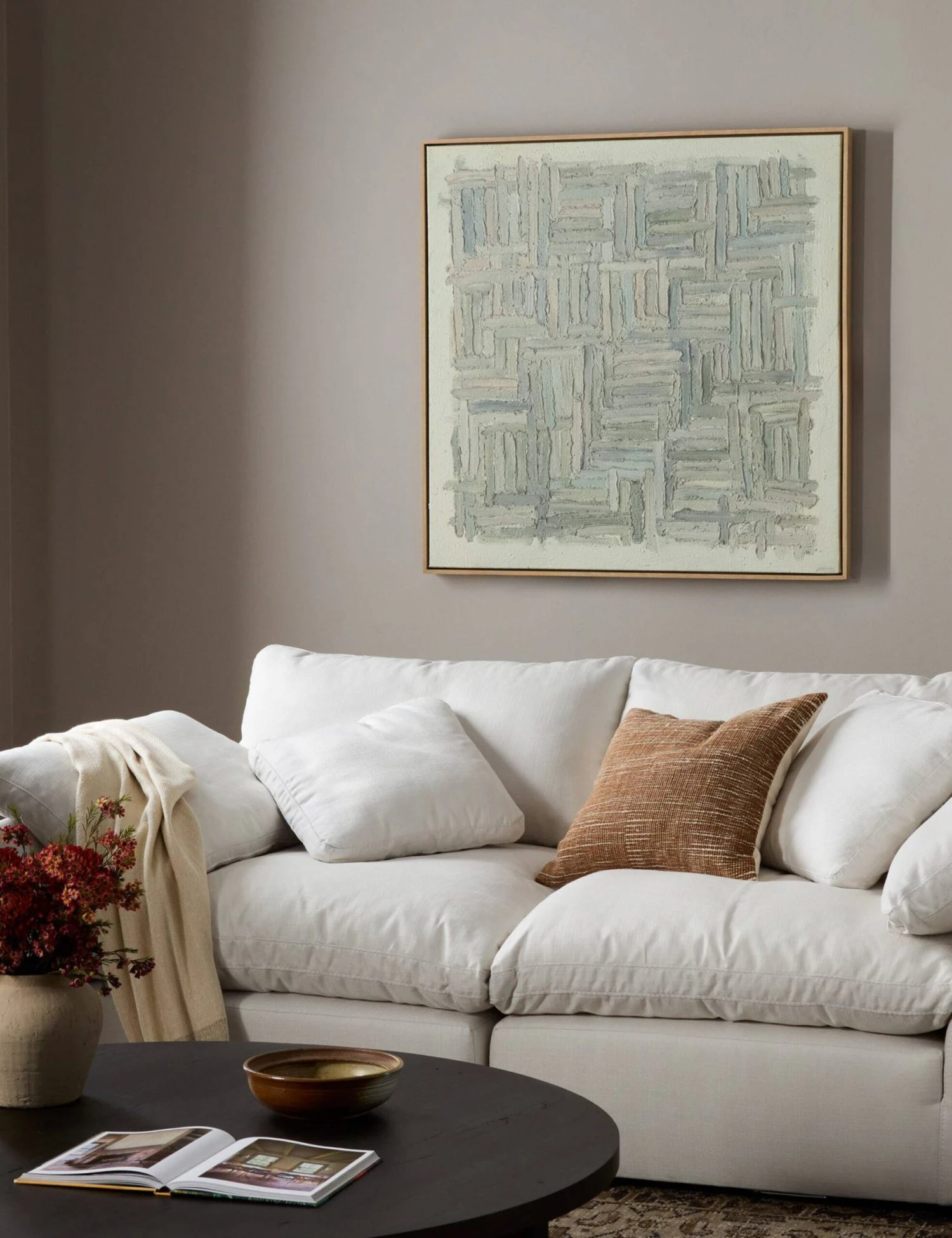 Artist Tyler Guinn creates rich, textural compositions marked by an organic sensibility. This piece brings a soothing depth to modern wall decor with its intricate arrangement of layered brushstrokes. Subtle shades of cream, white, and muted gray-blue form a rhythmic, interwoven pattern, creating a harmonious balance between structure and fluidity—a grounding touch for any wall art curation.
