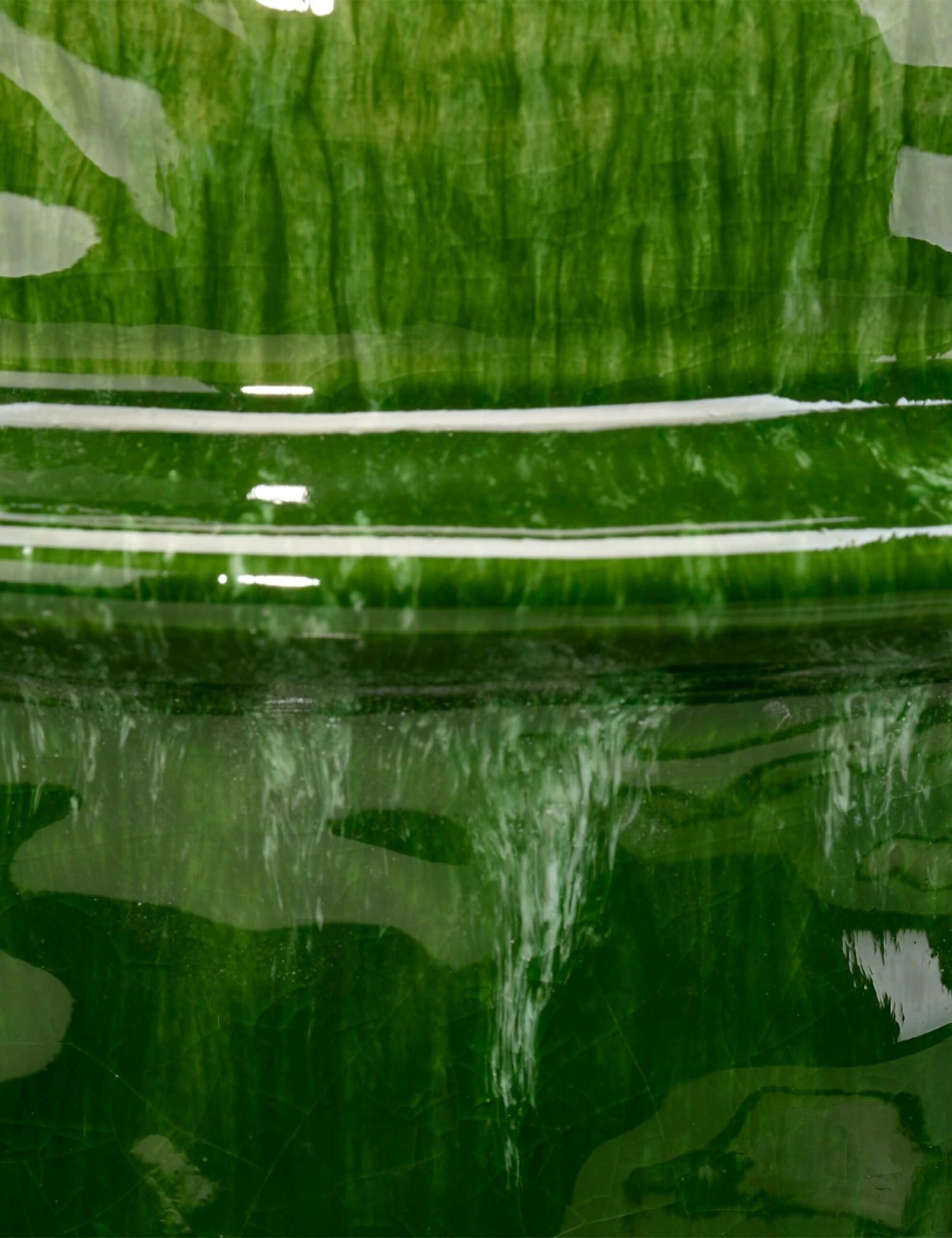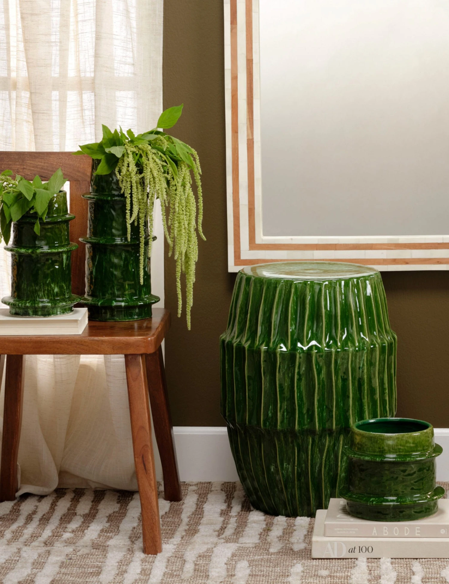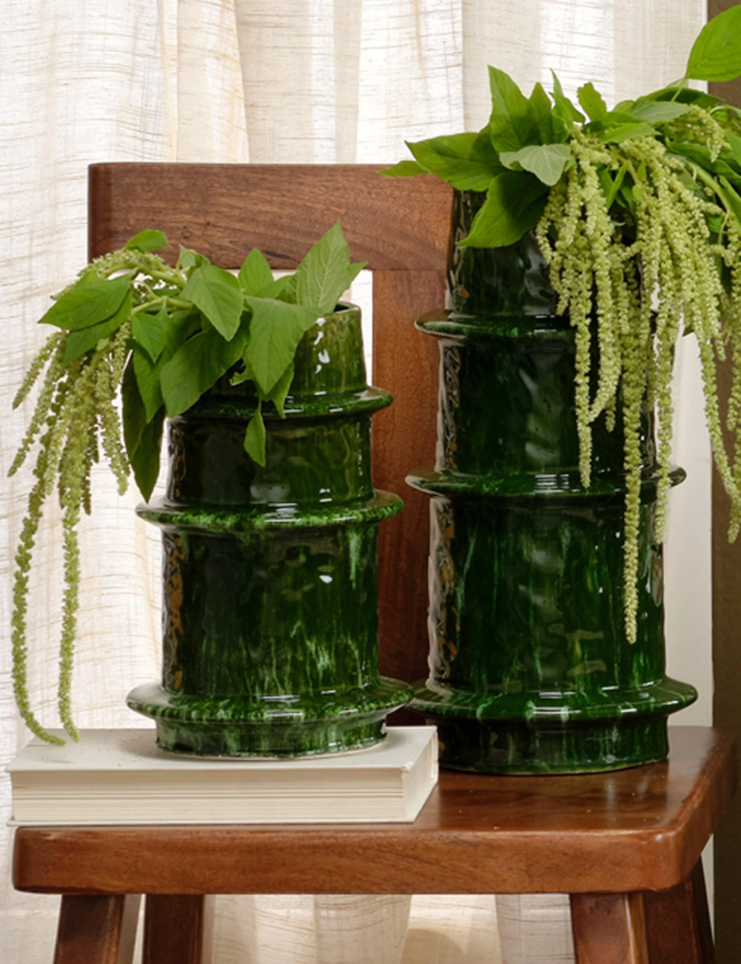 A ringed silhouette and glossy green glaze give this vase a refined form with bold impact. Each is artisan crafted with a reactive finish, offering rich tonal variation unique to each piece. Add flowers to highlight the color’s vibrant depth.