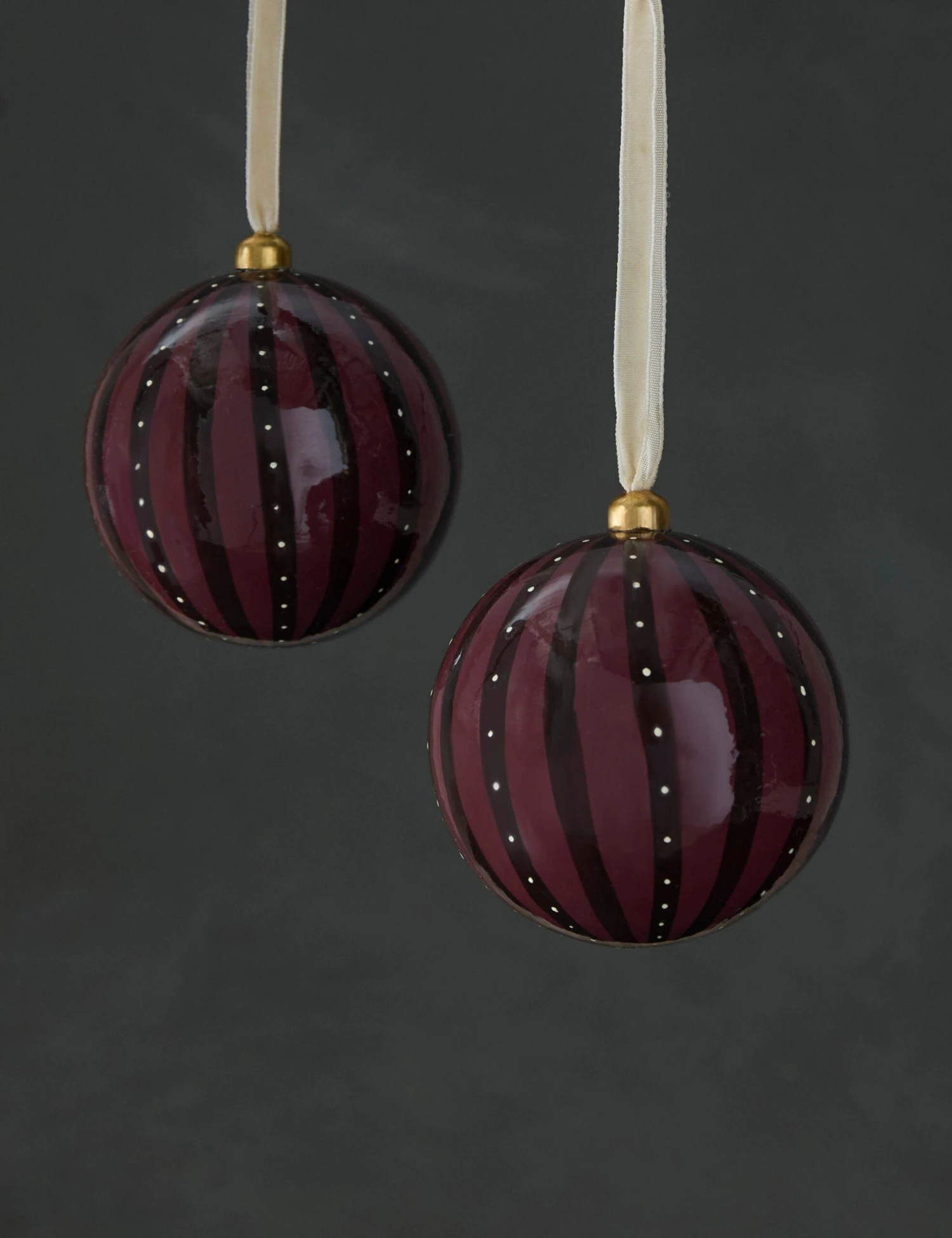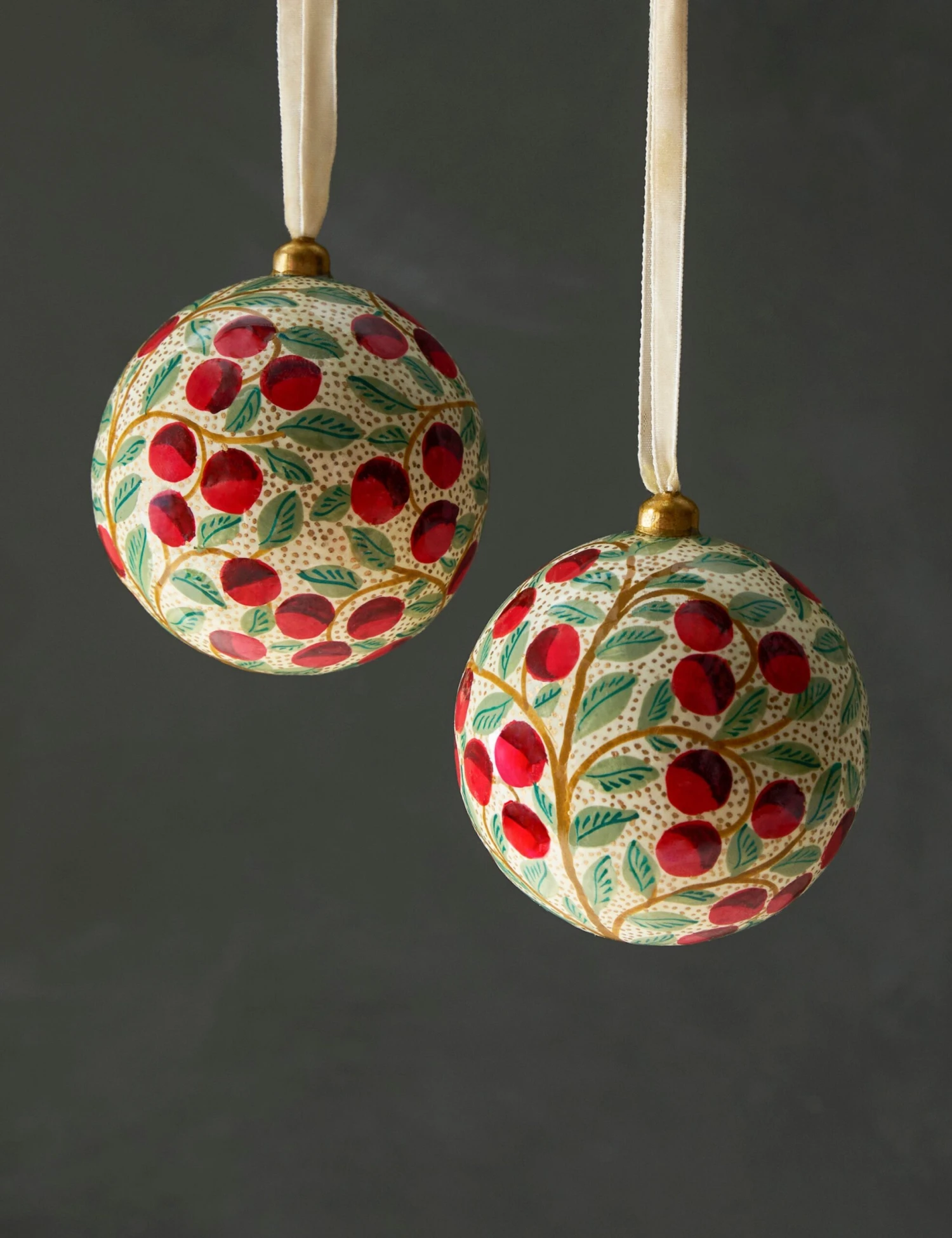 Add some cheer with a timeless touch. These hand-painted paper mache ornaments trim your tree with sophistication and charm. This matching pair is the perfect way to bring a sweet rhyme to your holiday decor.