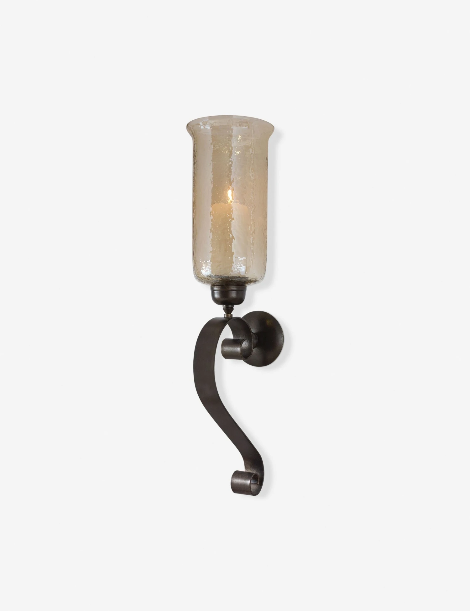 A hand-forged iron scroll is paired with transparent amber glass in this candle wall sconce. The sconce offers the depth and richness of a bronze finish, creating a dramatic but intimate ambiance in your living or dining room.