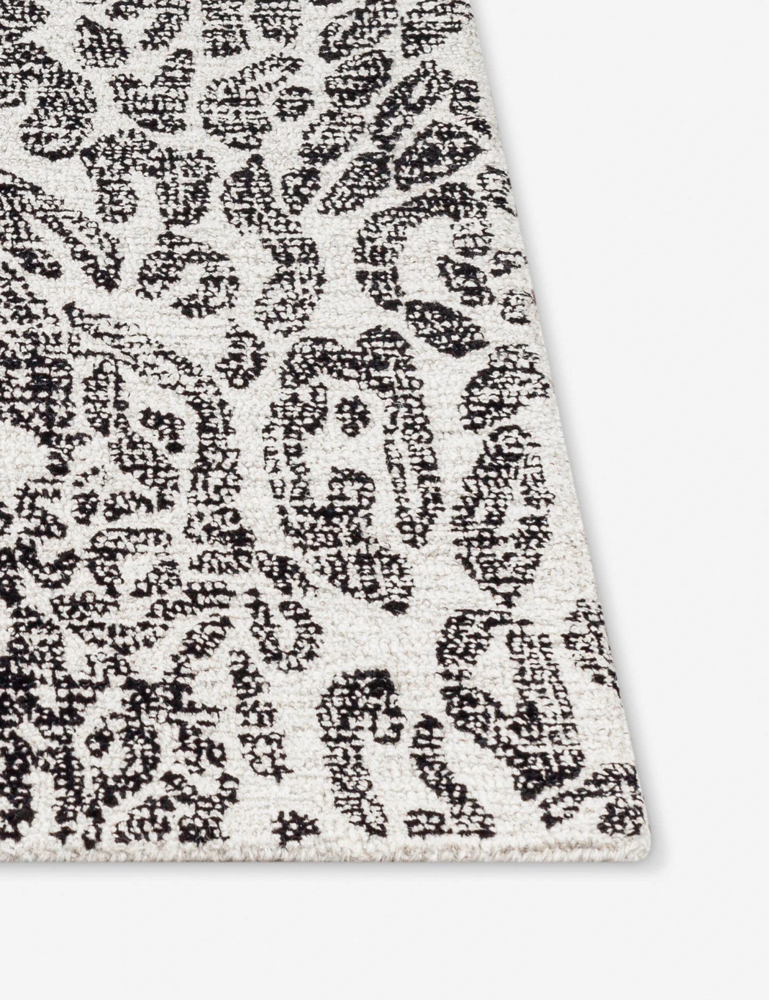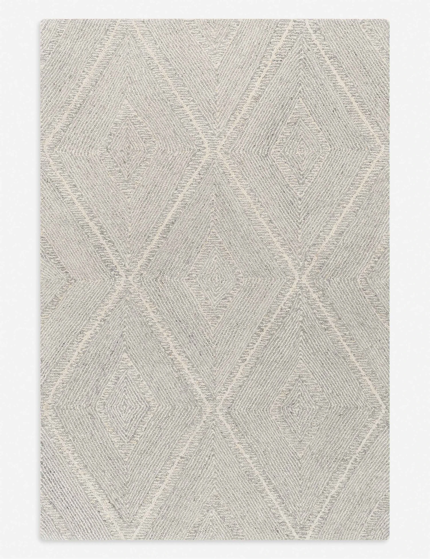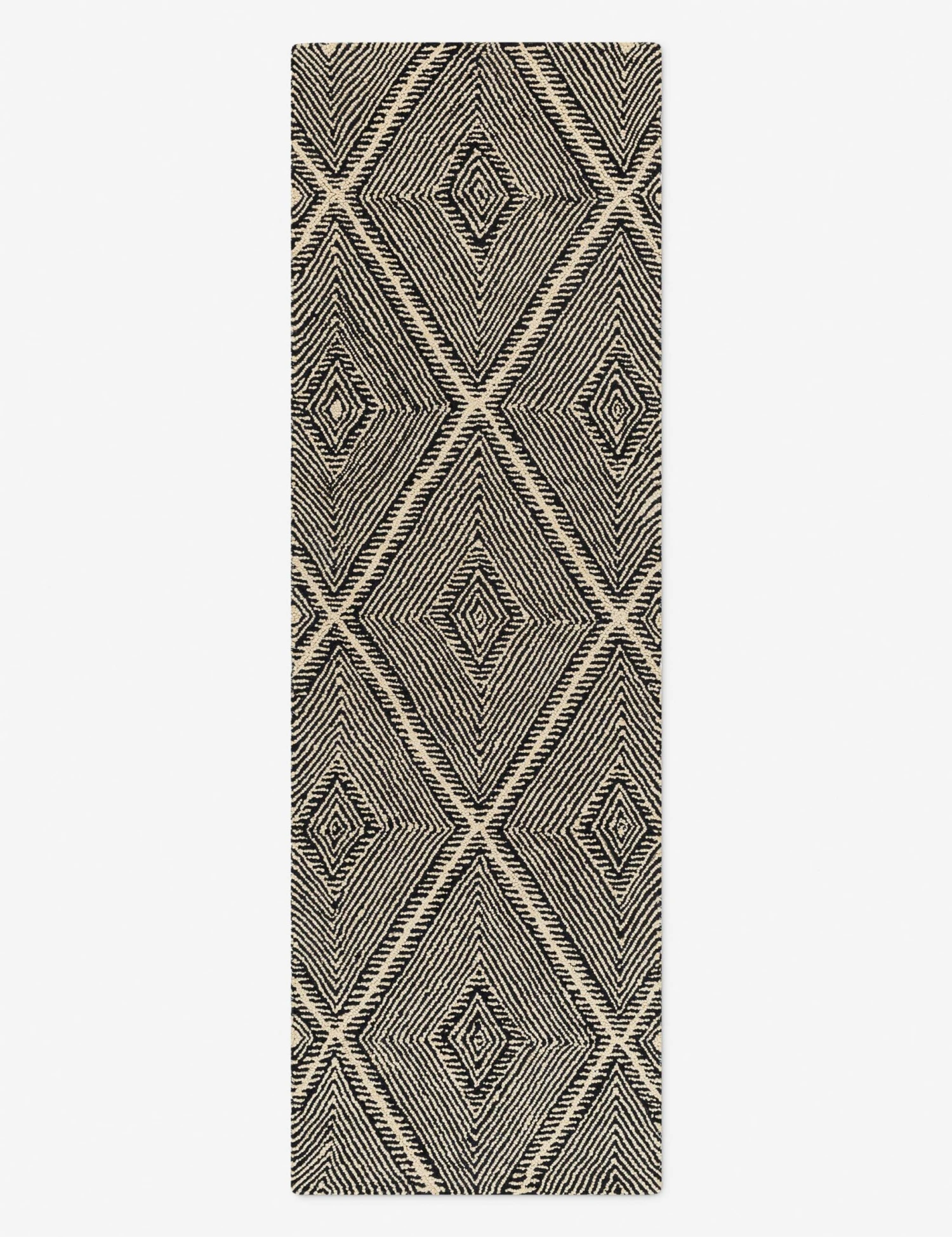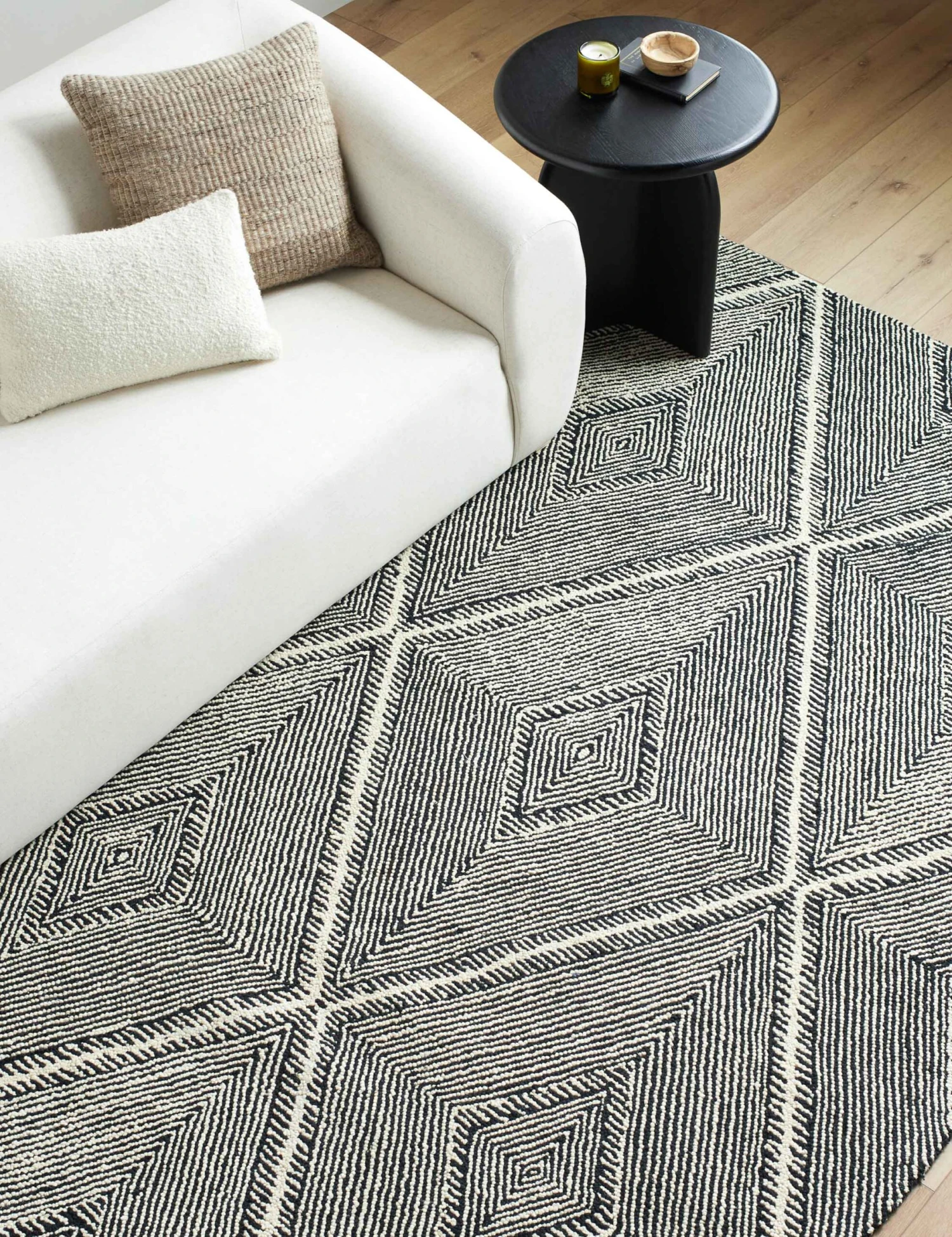Strike a modern tone with this rug’s geometric design. The hand-tufted rug’s stripe-on-stripe diamond pattern pops in a high-contrast palette. With its plush woolen pile, it’s perfect for sophisticated spaces.