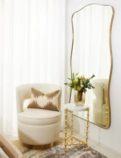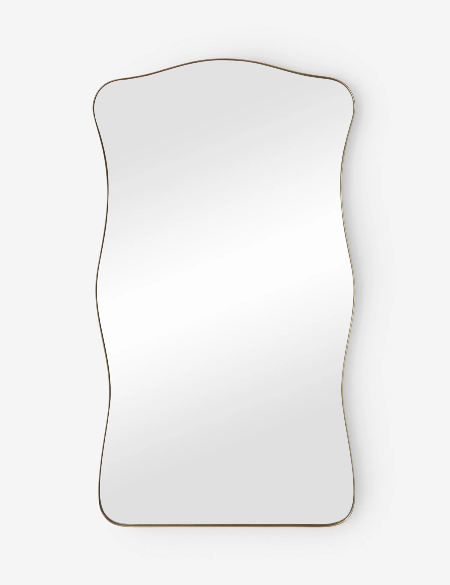 Supple, sophisticated curves define the Lemay floor mirror. This versatile mirror can lean or mount, offering a stylish presentation that brightens any space. Its feminine lines and beveled edge highlight a modern silhouette, delivering chic appeal in a dressing area or living room.