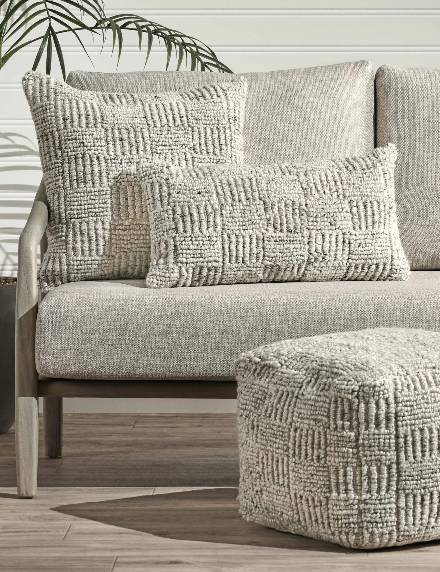 Alternating tiles of vertical and horizontal stripes create the illusion of a chunky weave in the Linzy accent pillow. Its palette complements any setting, from modern to casual, creating a versatile throw pillow with transitional appeal.