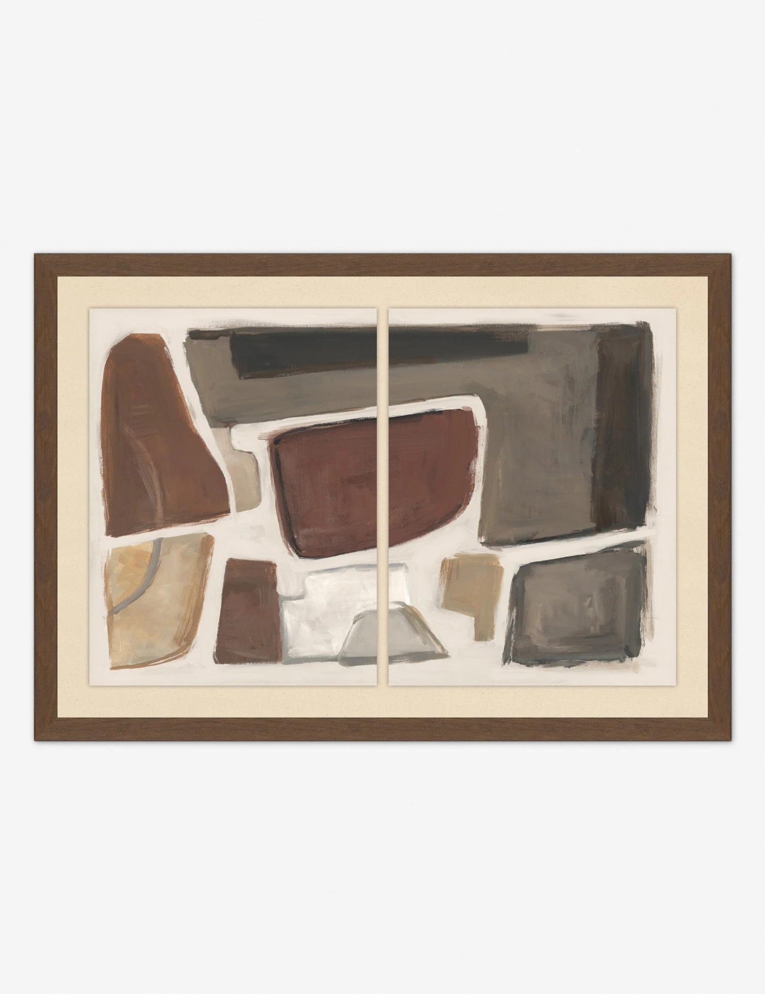 In an exploration of shape and color, this modern wall art features a dual canvas that’s framed under glass for a striking diptych effect. The warm, earthy hues and free forms of this wall art create a striking sense of balance, with a mat border and a wood frame for a gallery look and feel.