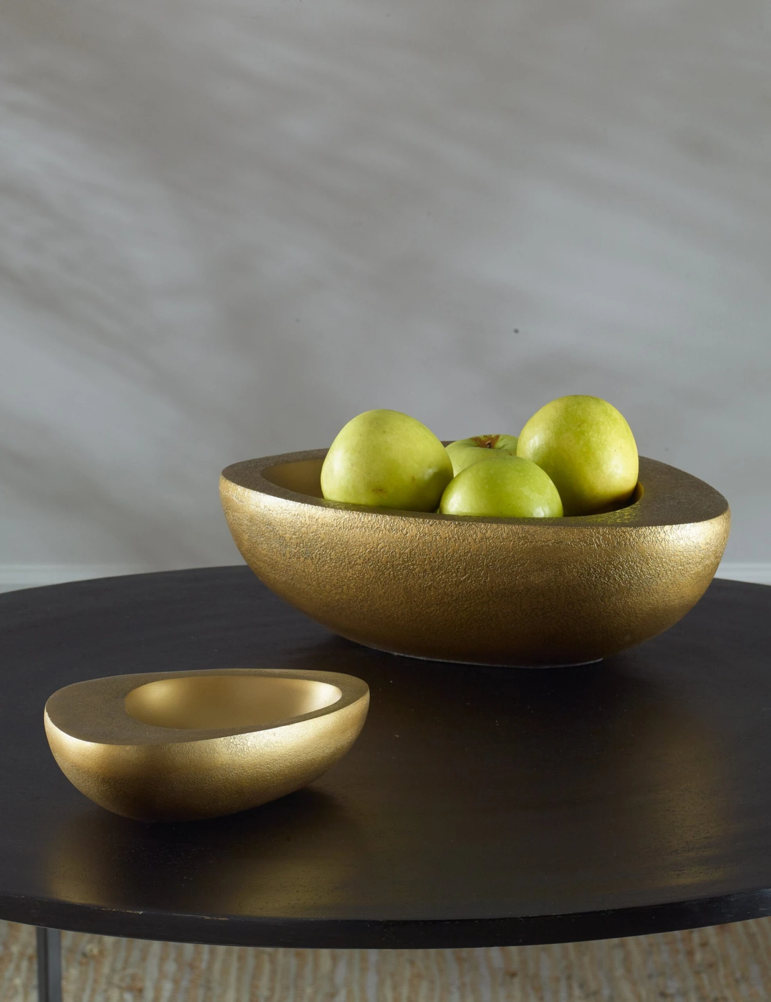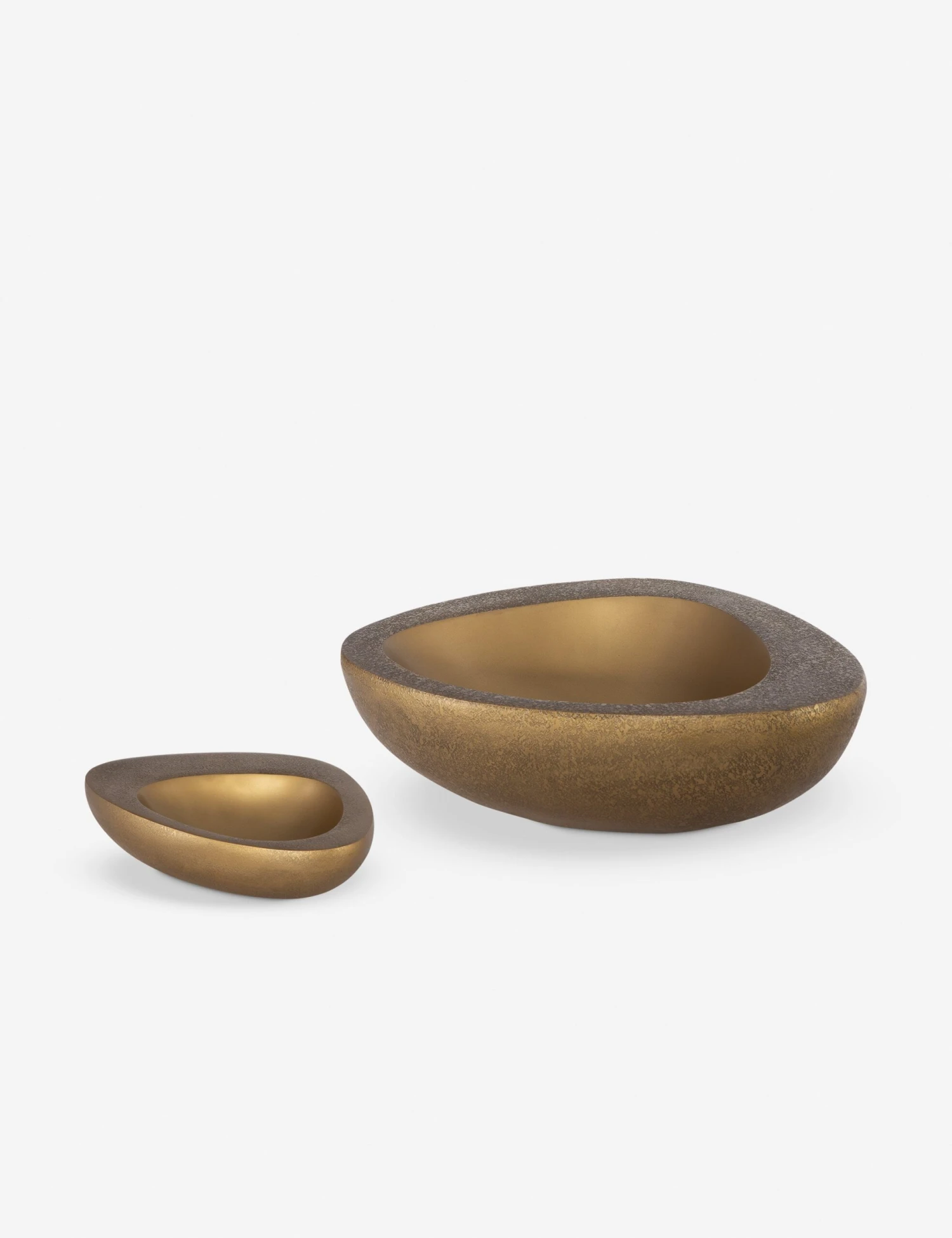 An antique brass finish highlights these sculptural bowls with warmth and elegance. Together or apart, they’re a striking choice for any tabletop, creating a chic spot to display peel-on fruit or a selection of decor.