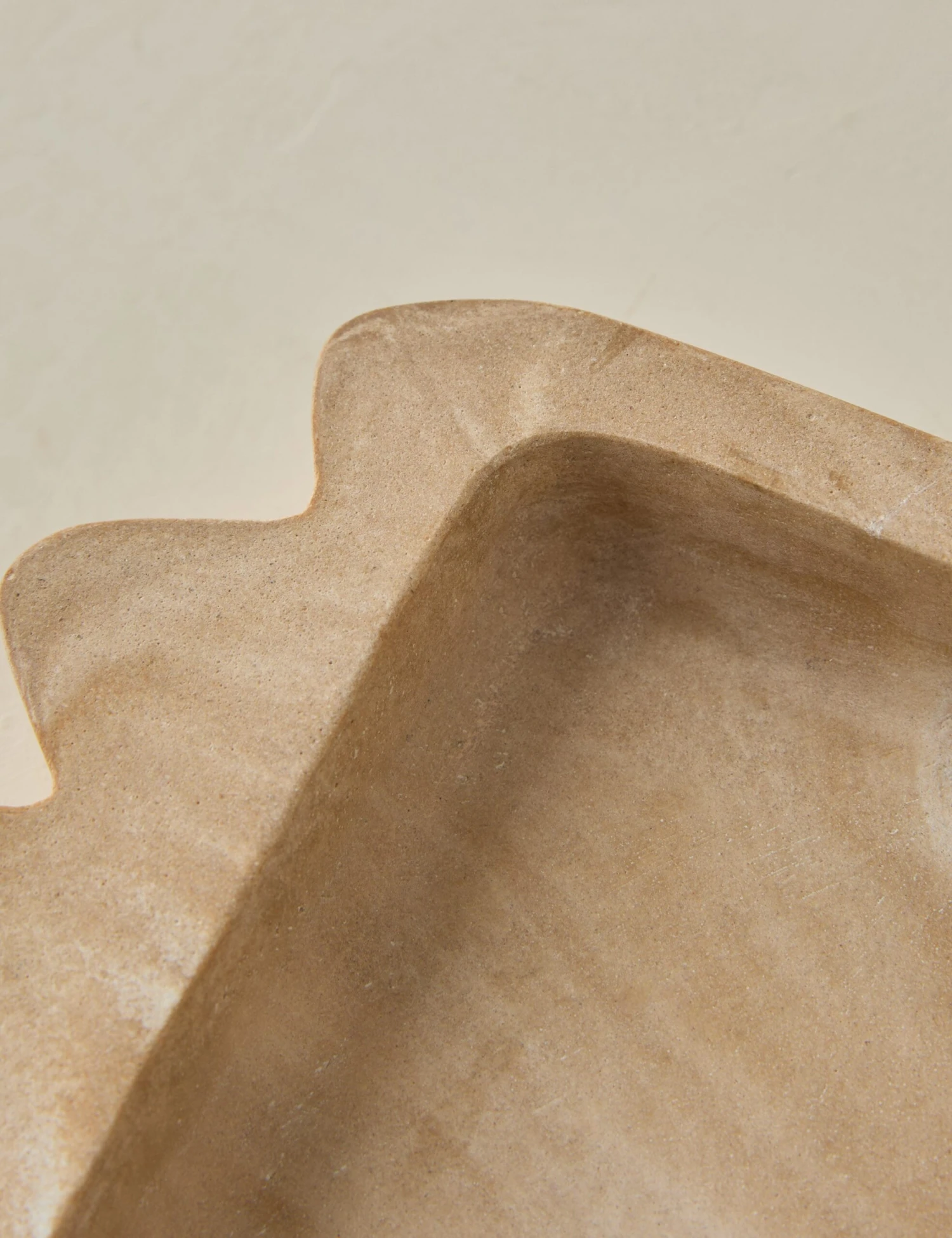 Our Melona tray is made to elevate your surface space. Skillful artisans transform resin, imbuing its whimsical shape with warm, mineral tones to create a travertine-like finish—luxe texture with a modern touch. This piece is a versatile addition, from kitchen counters and en suites to tabletop decor.