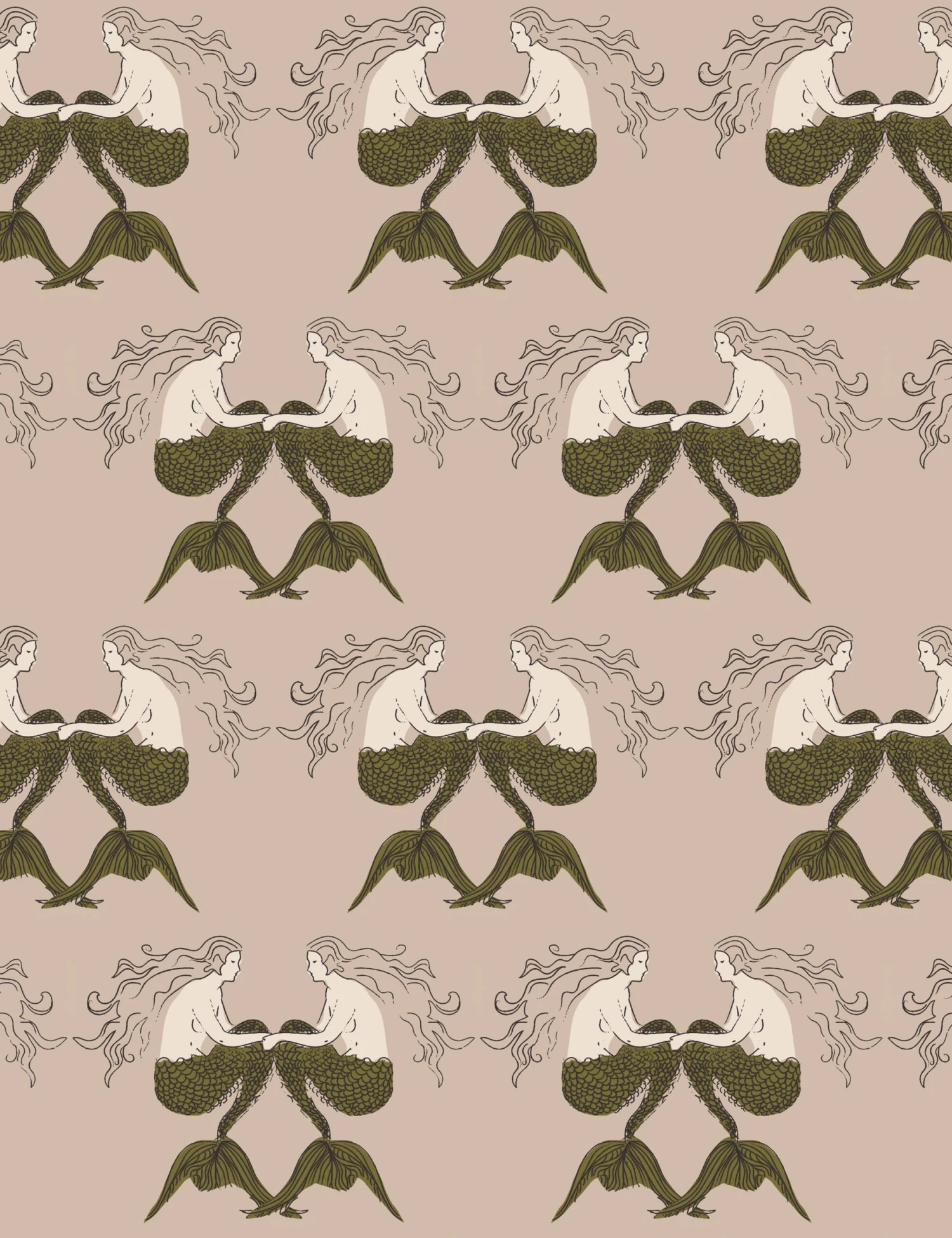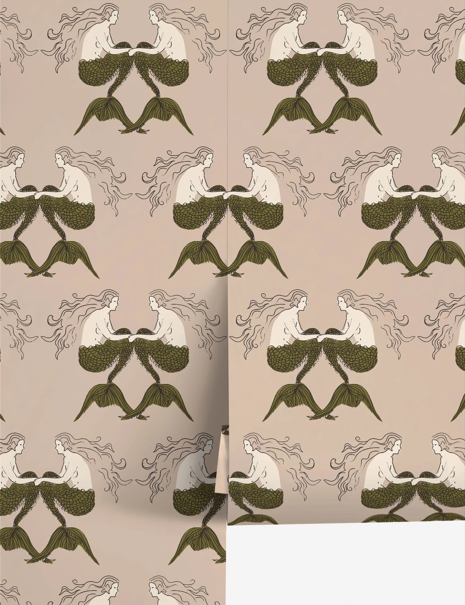 A mirrored mermaid motif brings whimsy and symmetry to the Meri wallpaper pattern. The intricate linework and stylized figures give this pattern a bold, graphic feel. This wallpaper is from our exclusive Sarah Sherman Samuel collaboration and features all the trademarks of her warm, edited style.