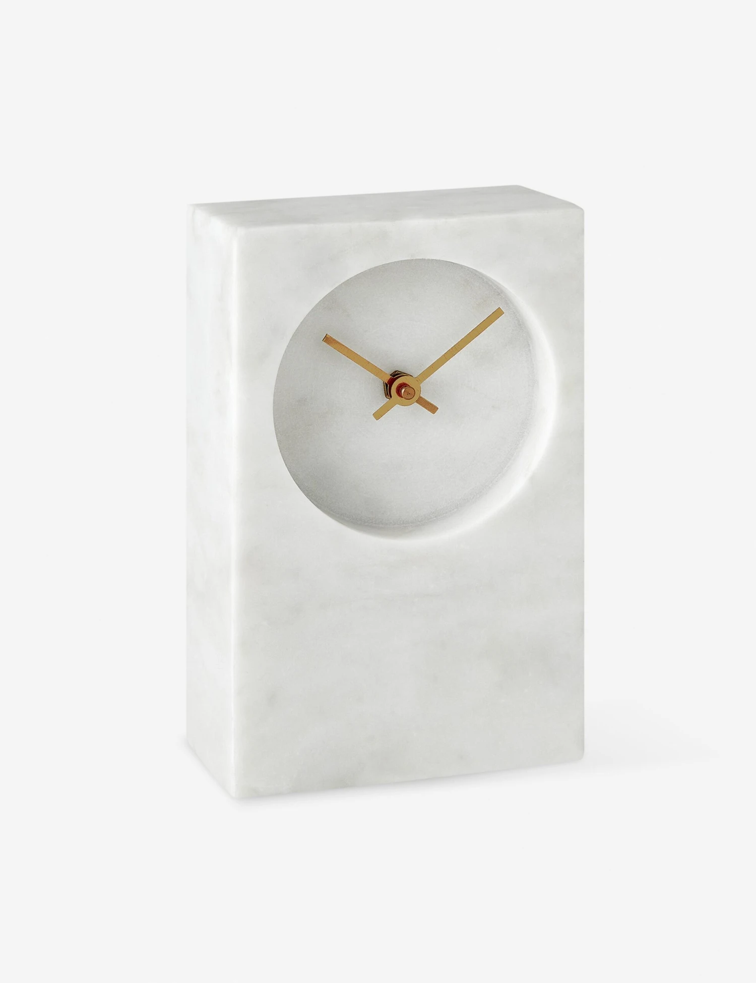 A minimalist design of marble and brass brings a timeless elegance to this tabletop timepiece. The small clock is the perfect size for a bookshelf, desk, or nightstand.