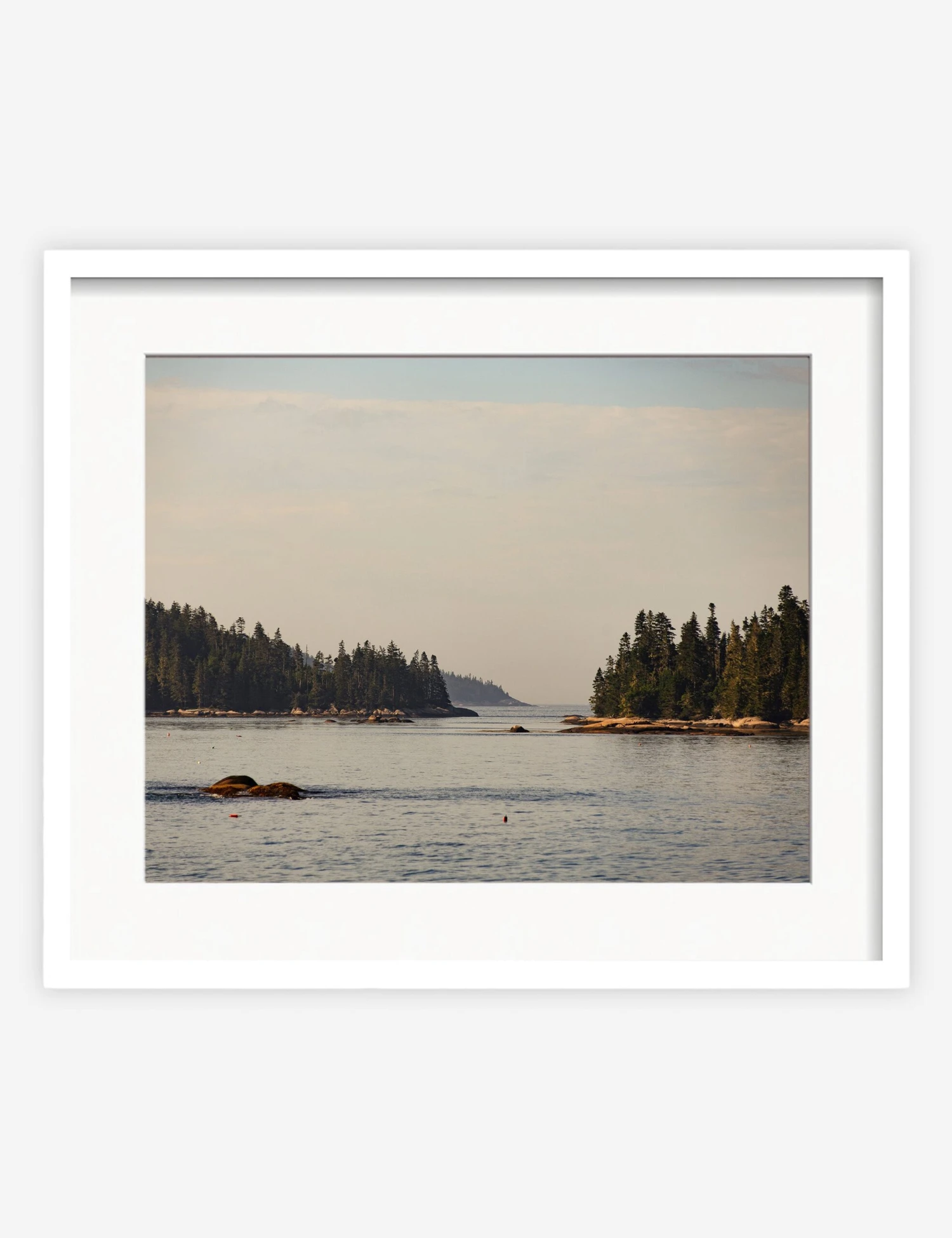The peaceful serenity of open water and lush green forests define this wall print from photographer Carley Rudd. Its calming influence is the perfect way to set the tone for cool, coastal wall decor in a bedroom or den.