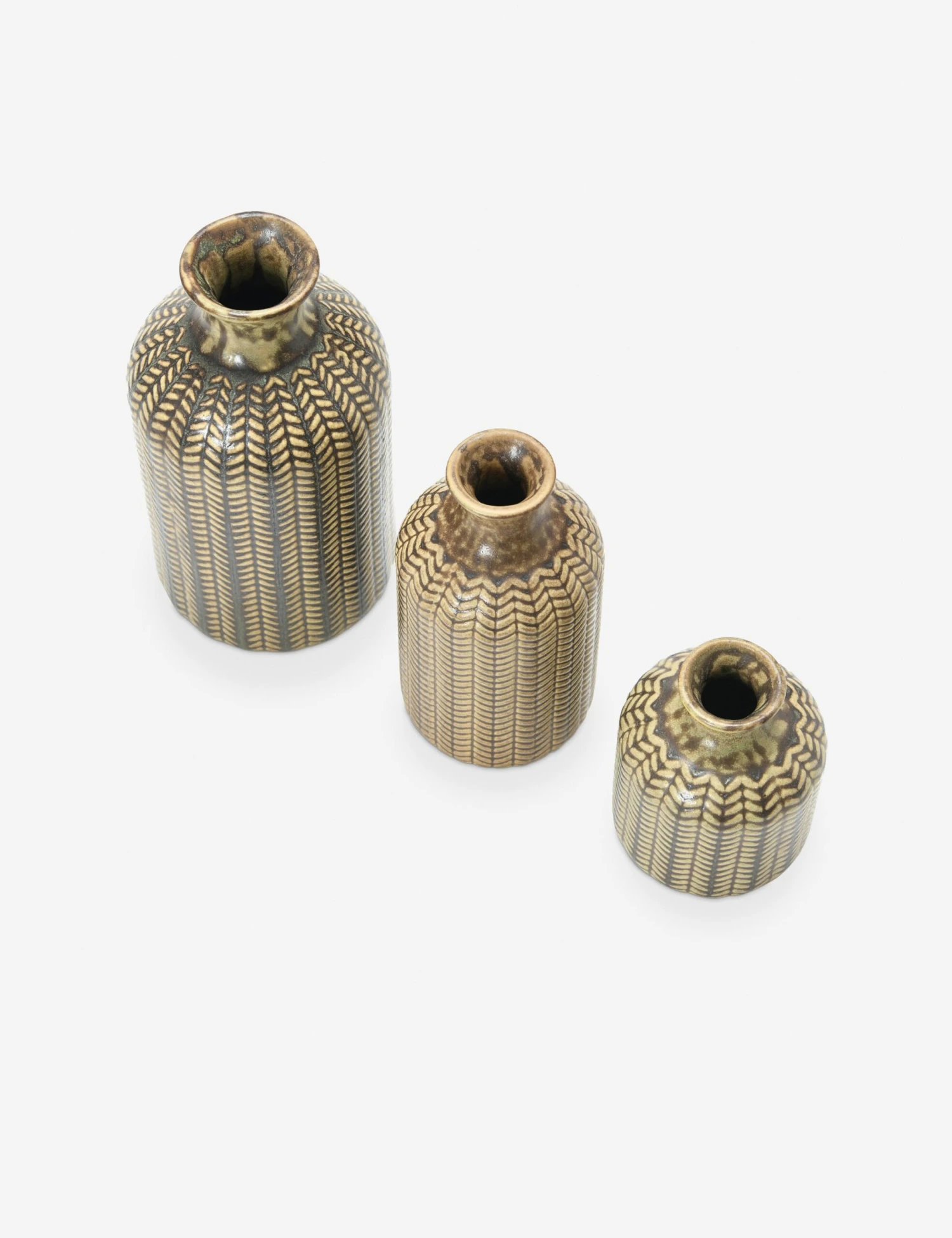 This trio of olive green stoneware vases features embossed textures and a matte reactive glaze for a rich, earthy feel. Group them on a mantel or use them to punctuate a shelf with color and artisan detail.