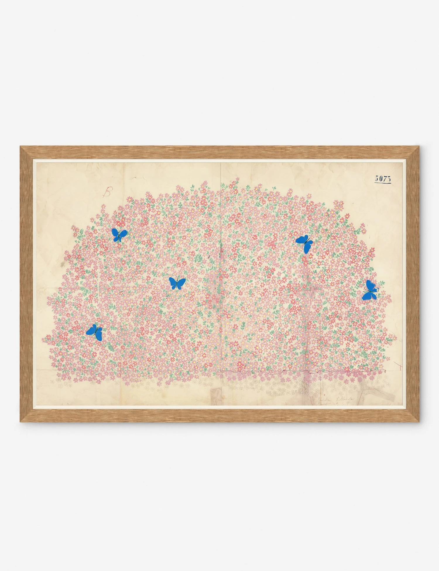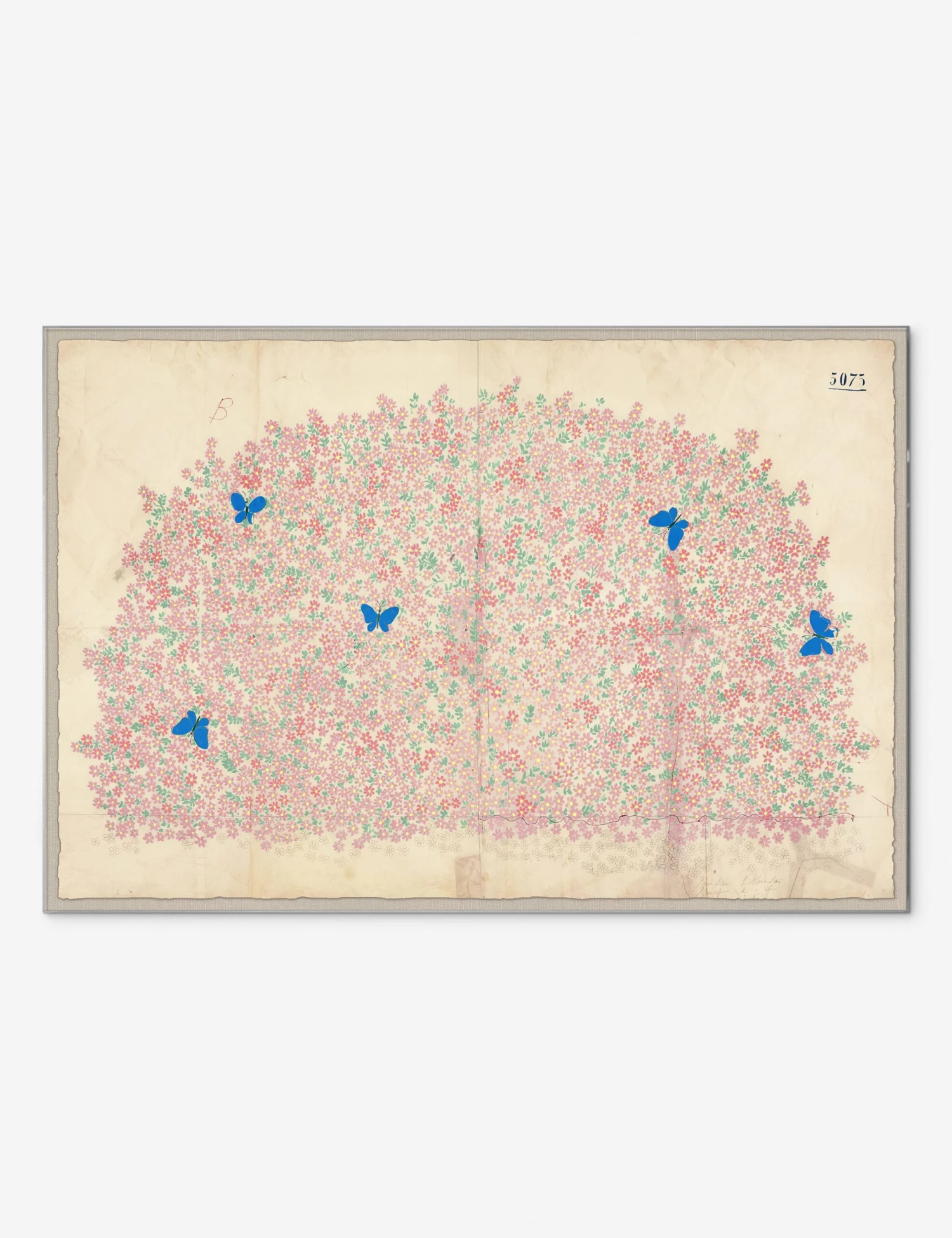 Elevate your wall decor with the iconic work of textile artist, engraver, and painter Paule Marrot. Each print captures her simple, lyrical style with boldness and fidelity—offering wall art with a fresh yet enduring appeal. Blue butterflies float over a thick cluster of flowers in this design—with marks showing the artist’s process.