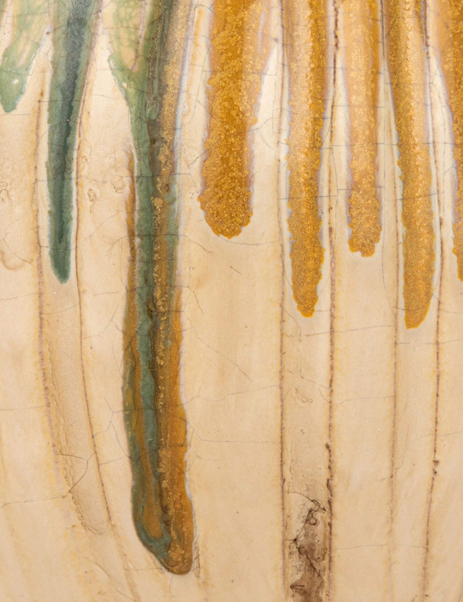 Ribbed detailing and a hand-applied glaze in ochre and green give this terra-cotta pitcher a beautifully timeworn feel. Display it on a shelf or kitchen counter to lend a rustic note with vintage flair.