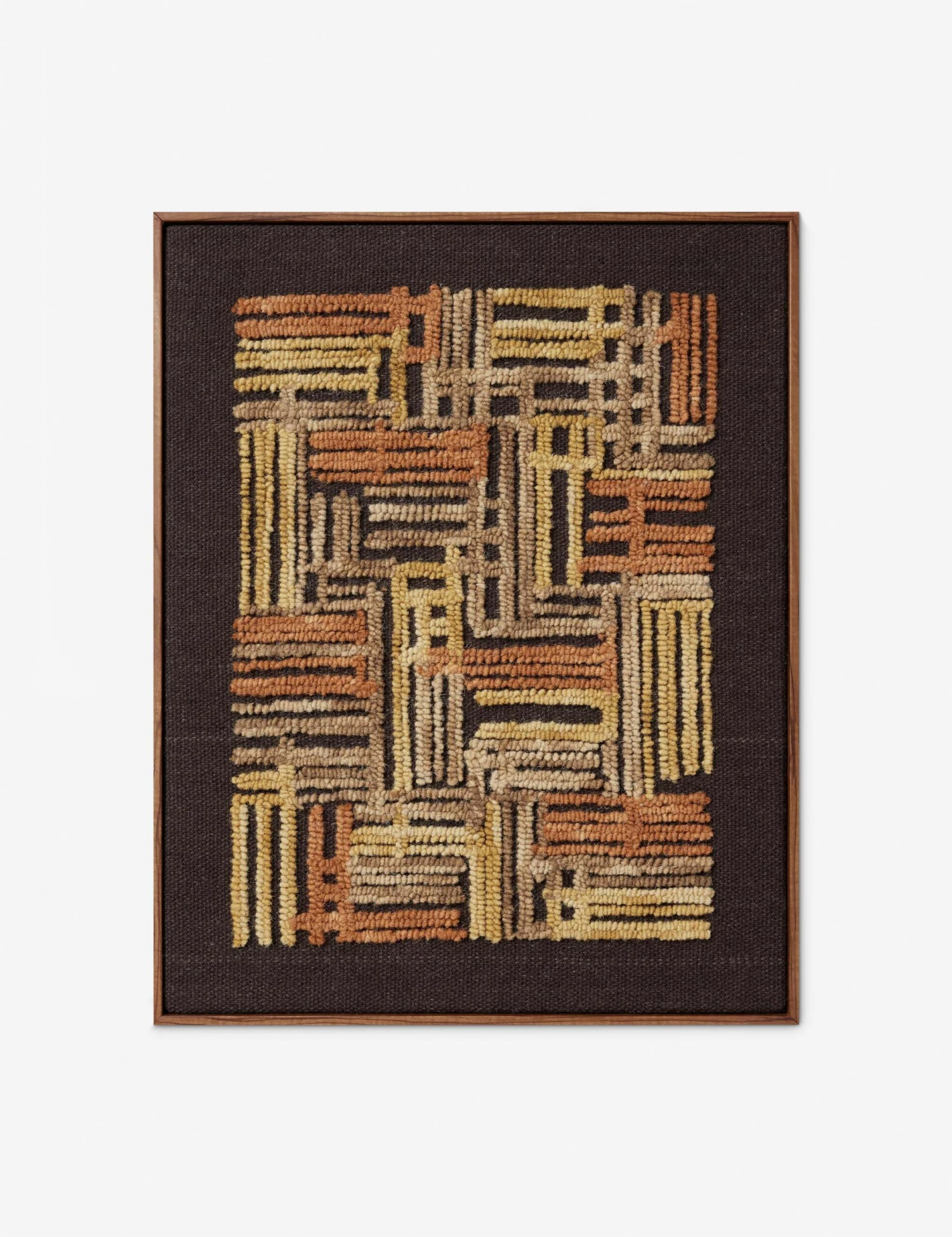 Turn up the texture in your wall decor with this stunning textile artwork. Its geometric design and modern palette make a striking statement in any room. In a light wood frame with a black backdrop, this piece pops in modern curations and transitional edits alike.