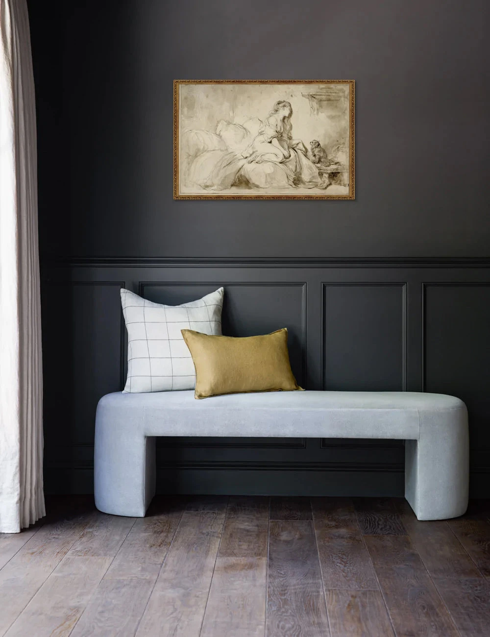 Satirical and light-hearted, this black chalk and brush painting by Jean-Honoré Fragonard juxtaposes a young woman’s exaggerated distress over her lost love, with her dog’s unwavering loyalty. Fragonard’s light, fluent washes also convey a sense of abandonment, and contrast with the arresting precision of the woman’s face.