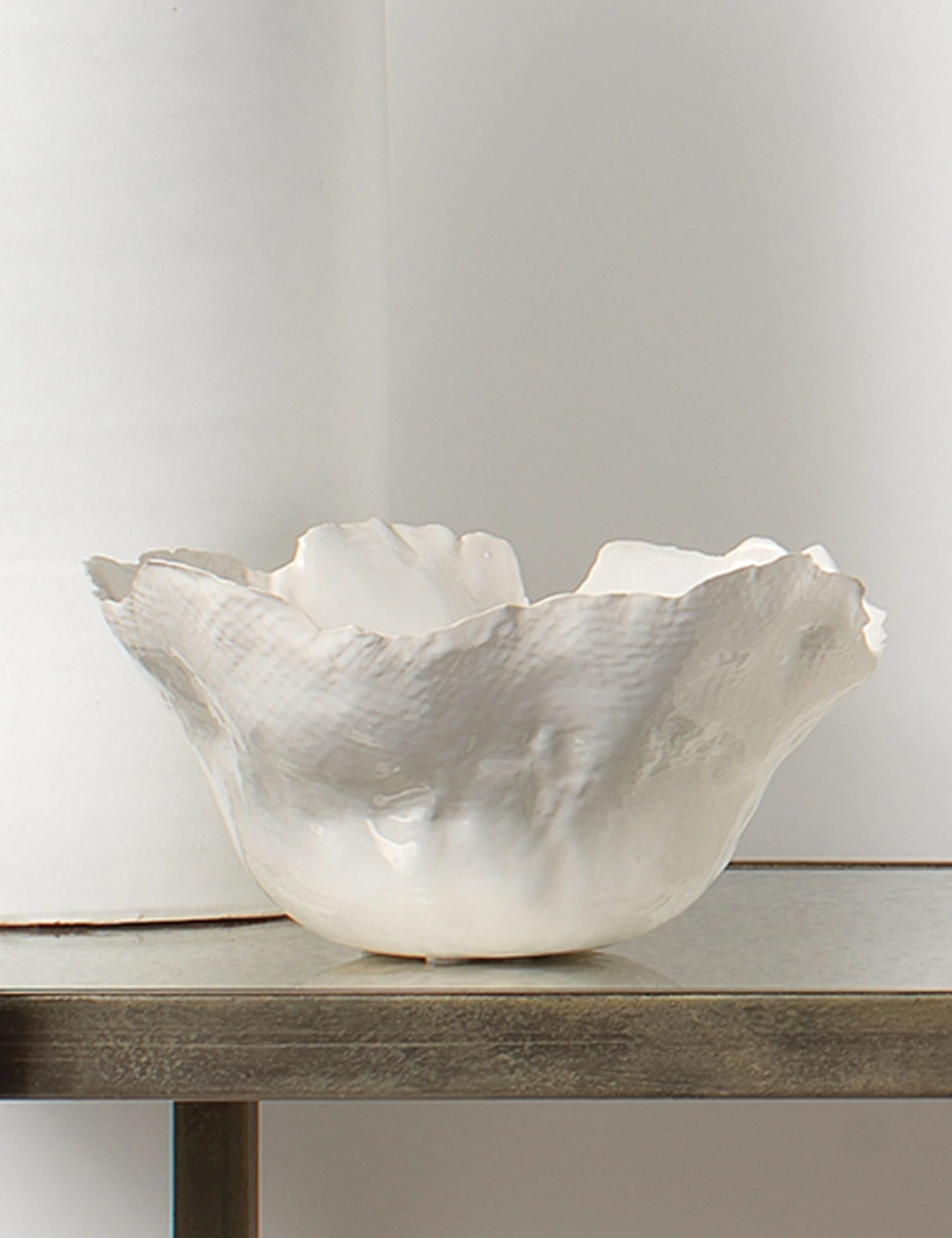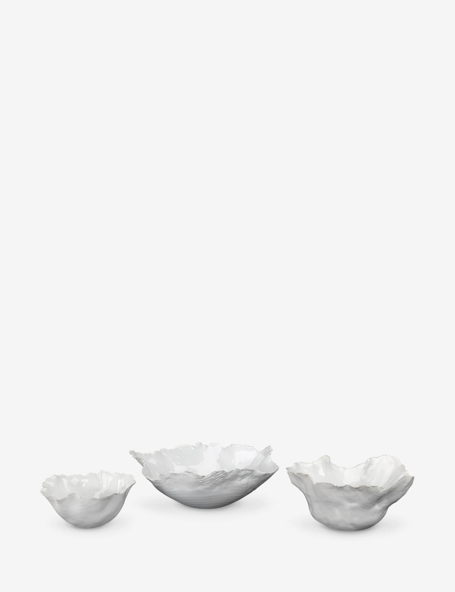 Fluid yet composed, this trio of catchall bowls features soft organic edges with an open, sculptural form. Their delicate lines are perfectly imperfect, styling an effortless accent for a vanity, entry console, or curated shelf.