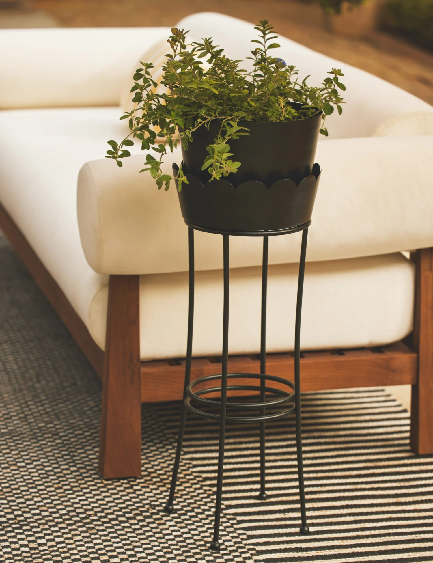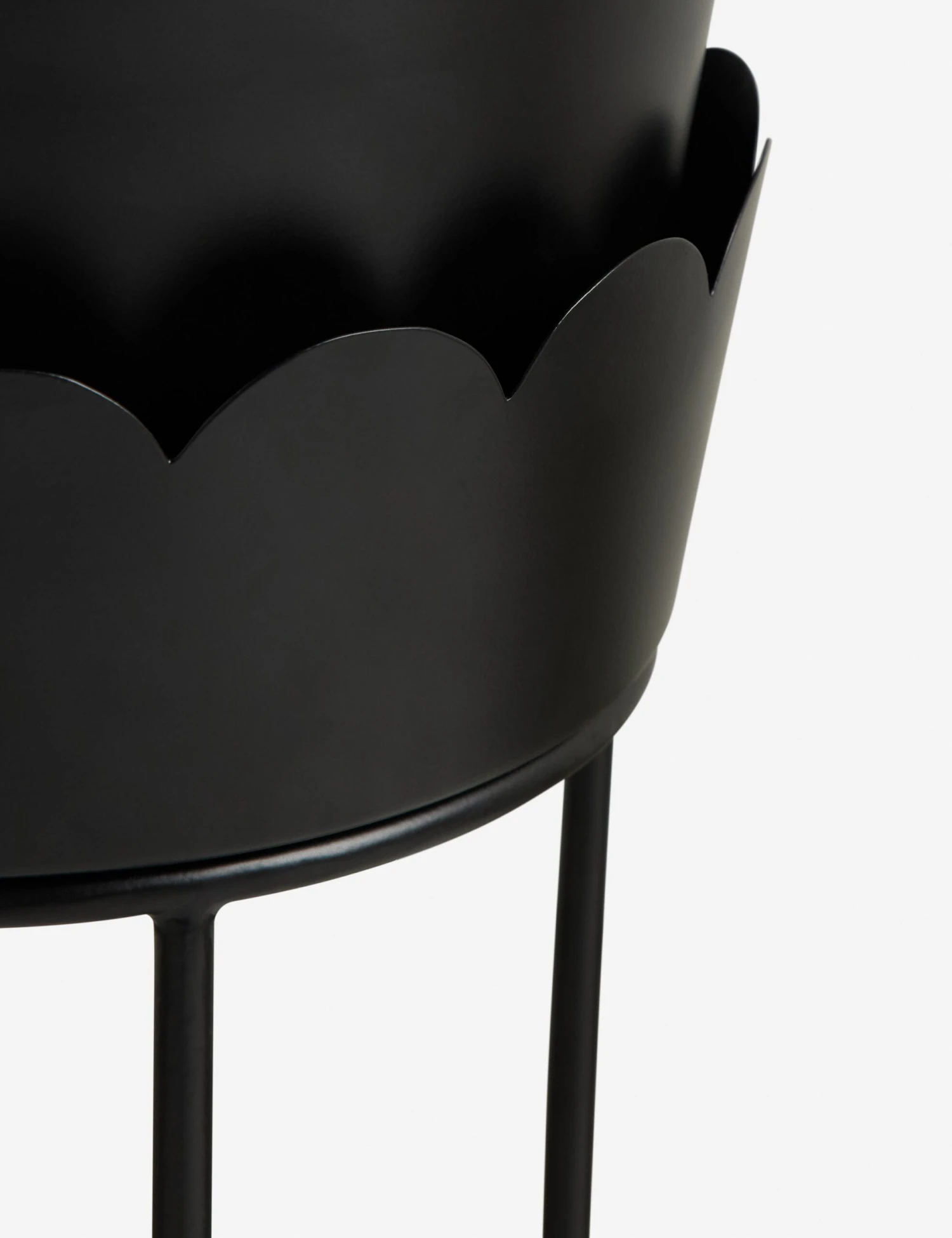 Bring a stylish edge to your greenery with our Onyx planter. The sleek design features a slender metal stand with scalloped detailing for a chic touch. The black powder coat finish offers a versatile addition to any space.