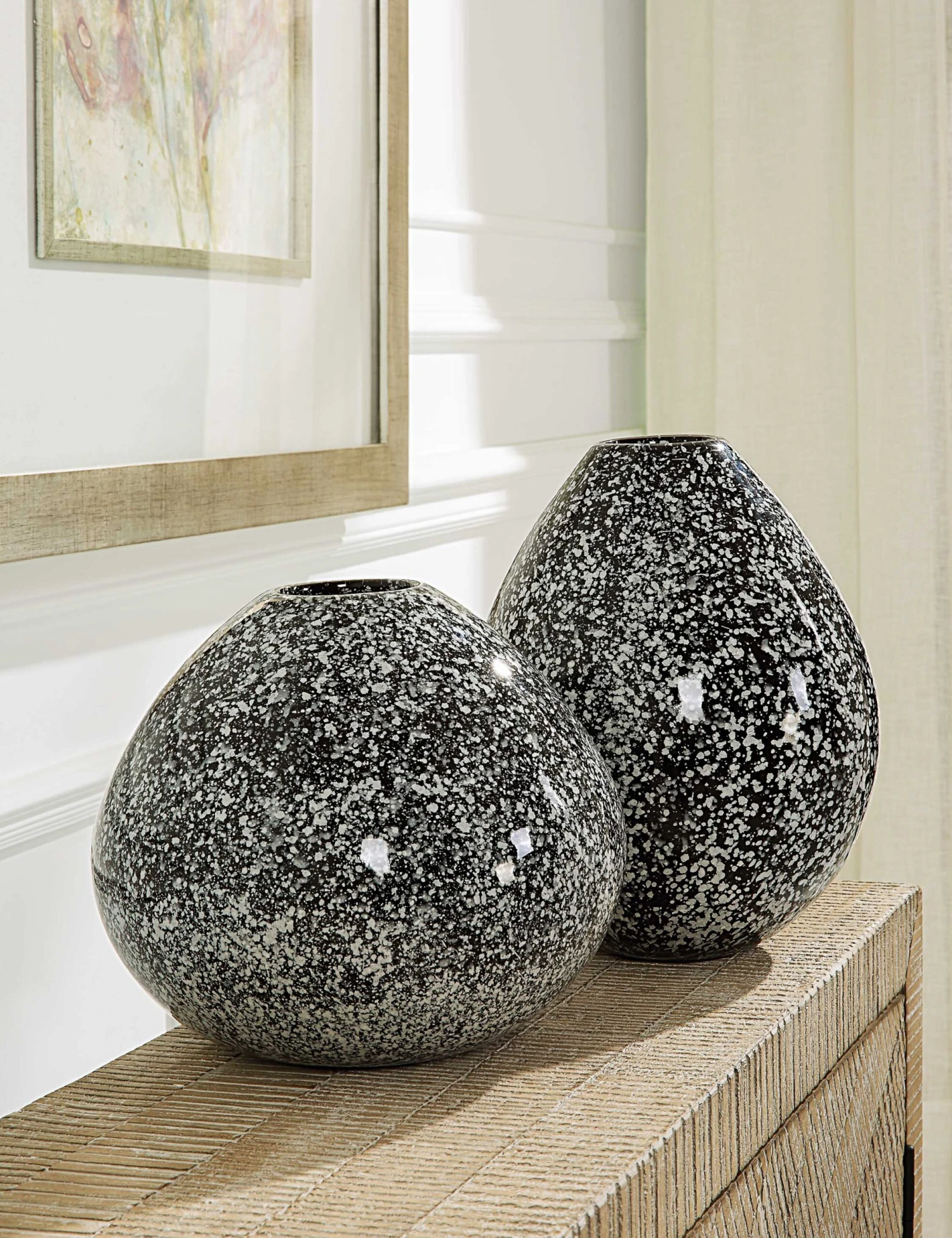 A blanket of stars provides the inspiration for this set of decorative vases. Elegant sloping silhouettes are timeless and refined, with a neutral two-tone palette that will enhance any setting.