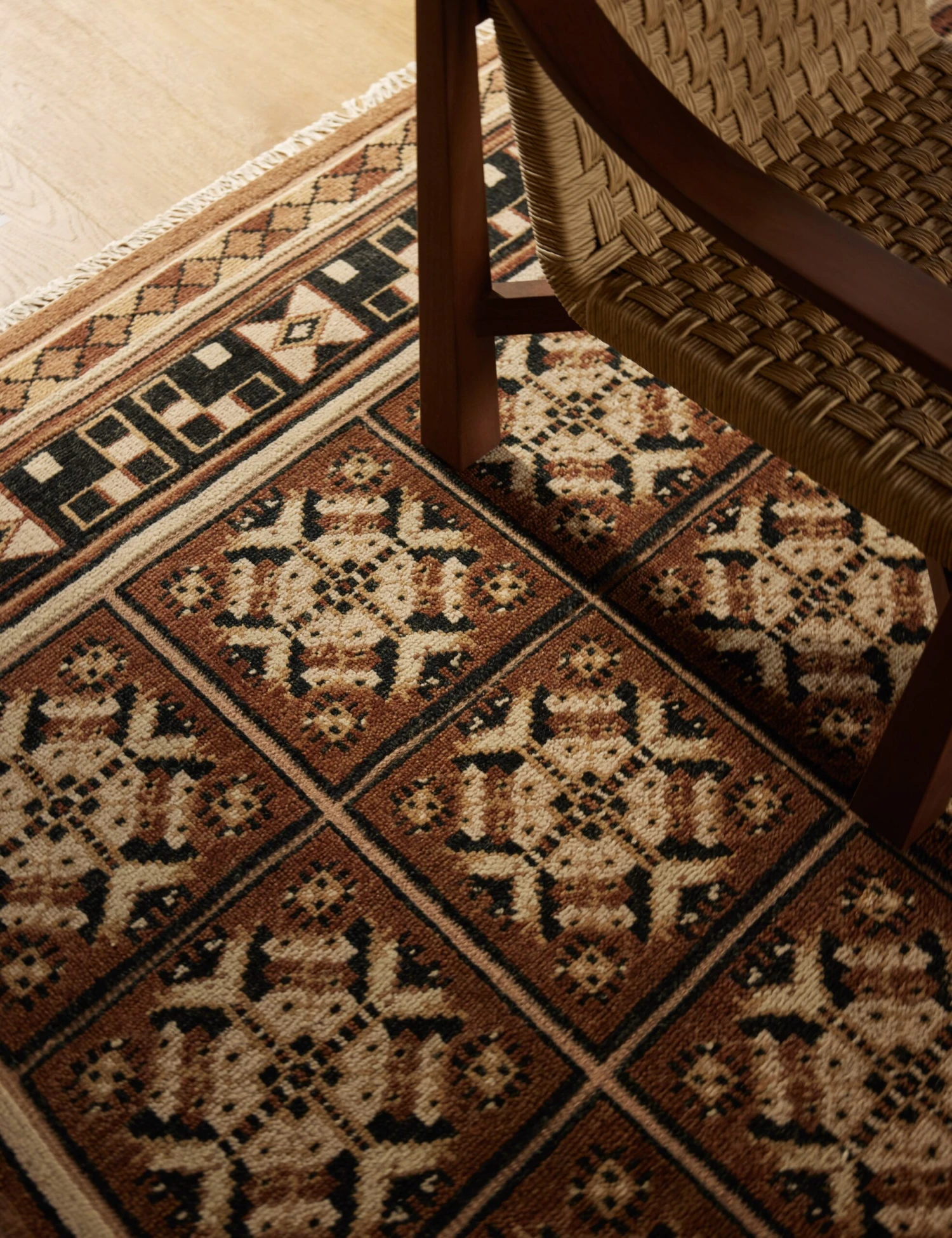 The Ovidi rug draws from heritage motifs for a richly layered look. A border of traditional patterning surrounds a tiled field of geometric medallions, offering a composed, grounded feel. Made from wool with a classic fringe, this hand-knotted rug provides a lasting foundation set for softness and timeless appeal.