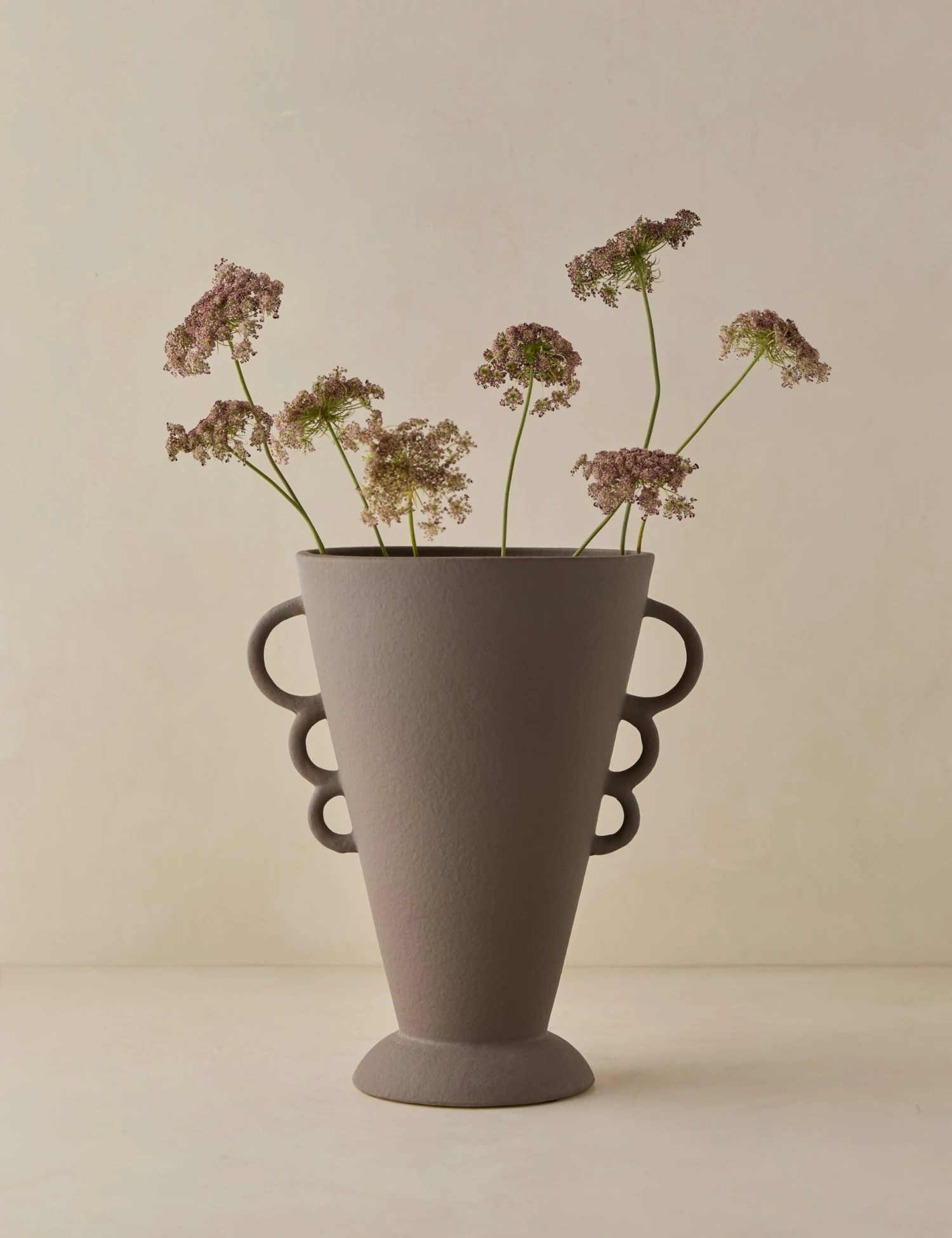 In this exclusive collection, Aimee Song brings her beloved fashion sense home with artful elements designed for living. The Panthea vase features a tapered silhouette with loop handles in a textural finish. We love how this piece folds classic elements into a modern design to offer a striking accent. Style alone as a sculptural moment or with seasonal branches. Ceramic can be delicate—always lift and support from the base when moving.