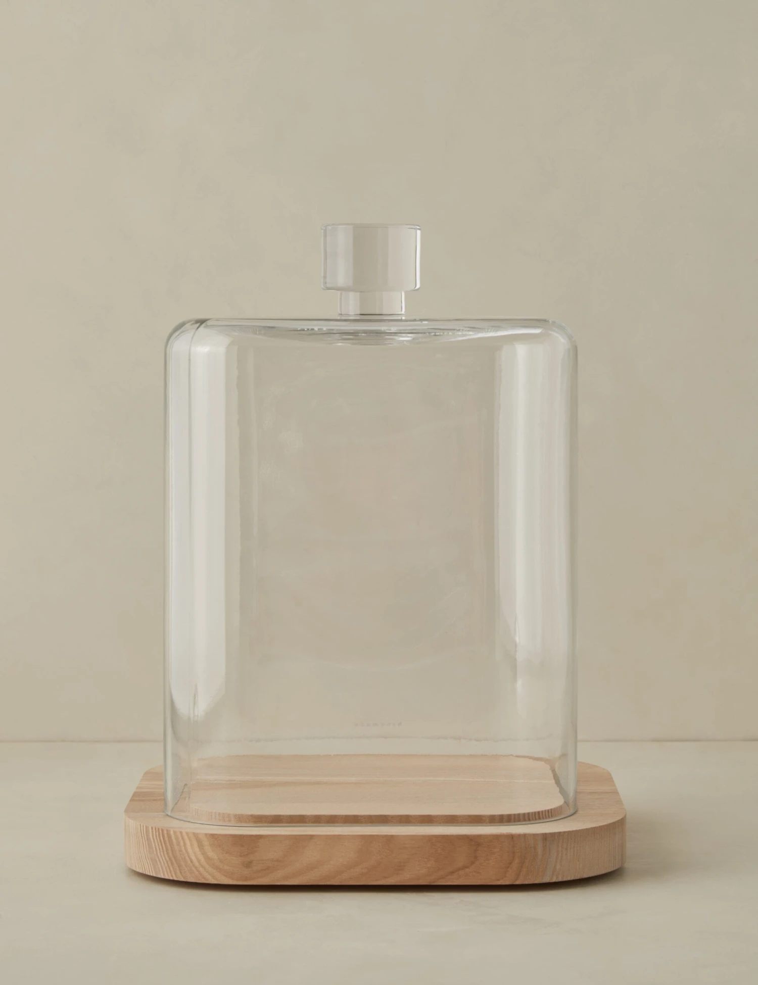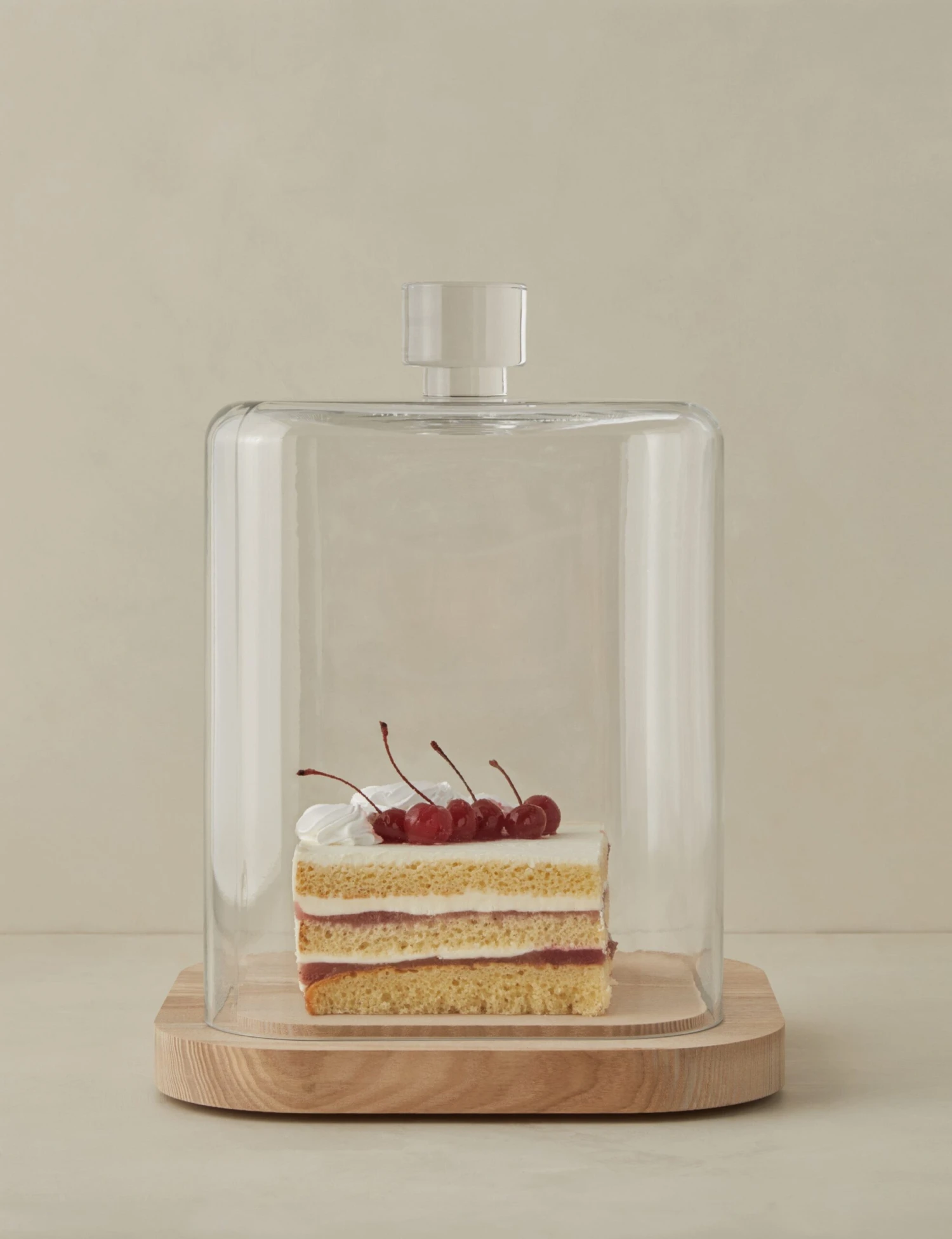 Let your sweet and savory treats become part of the color on your counter or tabletop. The Pavilion dome brings stunning design to a kitchen classic. Its modern silhouette is made from mouth-blown glass, gently squared and set on an ash wood base that has been shaped by hand to snugly fit the top for longer-lasting freshness.